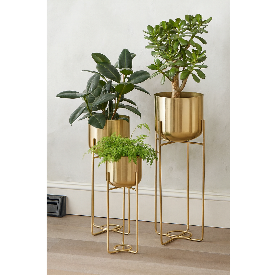 ขาตั้งสำหรับปลูกต้นไม้ในห้องนั่งเล่นทำจากโลหะชุบทองตั้งพื้นสำหรับจัดแสดงของตกแต่งบ้านชุดปลูกต้นไม้หรูหรา