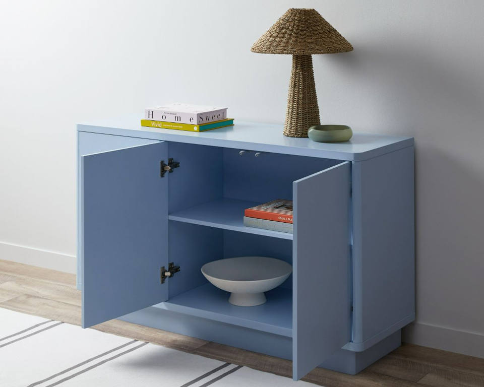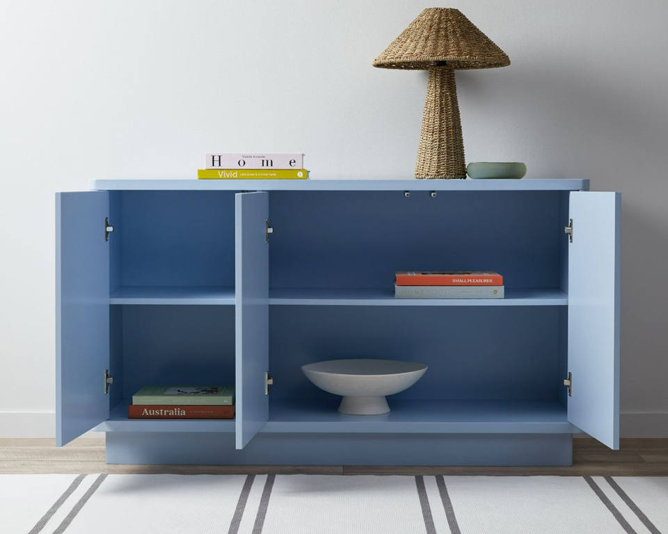 ตู้ข้างโซฟาห้องนั่งเล่น โครงไม้สักแท้ สีฟ้า พร้อมบานประตู 3 บาน สำหรับใช้ภายในอาคาร