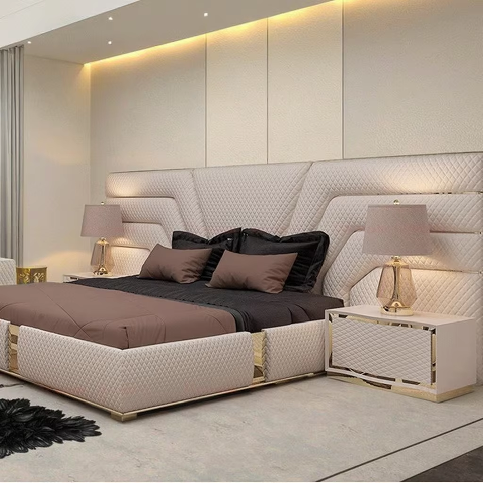 ชุดเฟอร์นิเจอร์ห้องนอนดีไซน์หรูหราทันสมัยจาก Lj Furniture เตียงคิงไซส์หุ้มหนังแท้