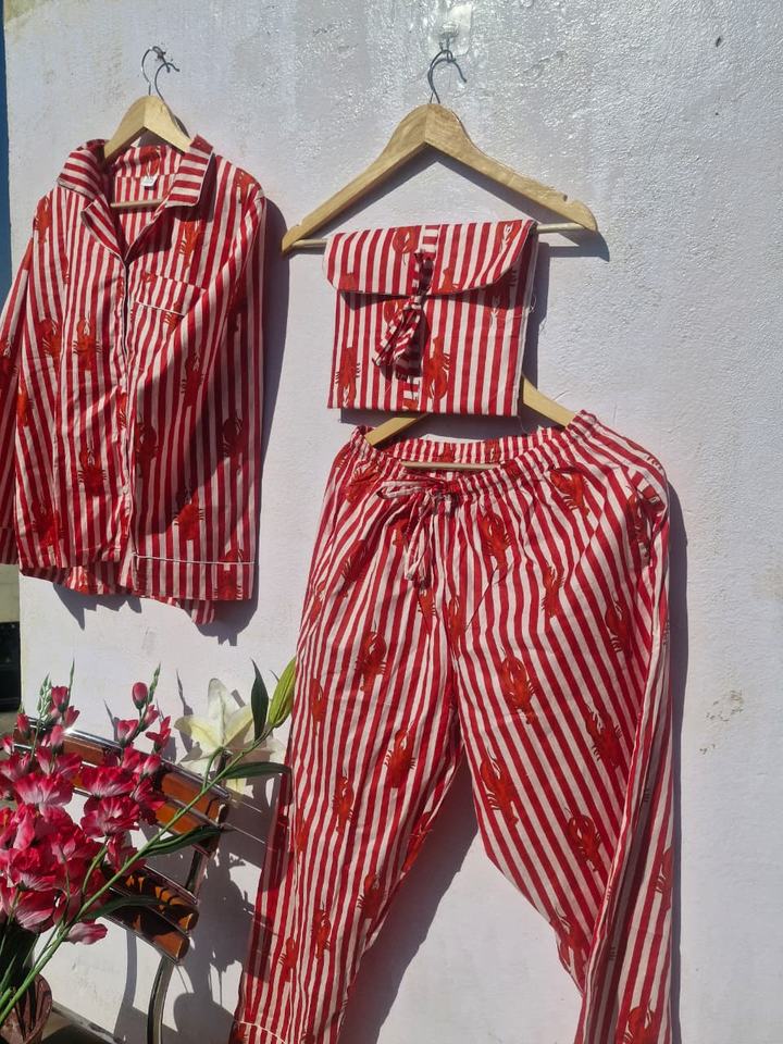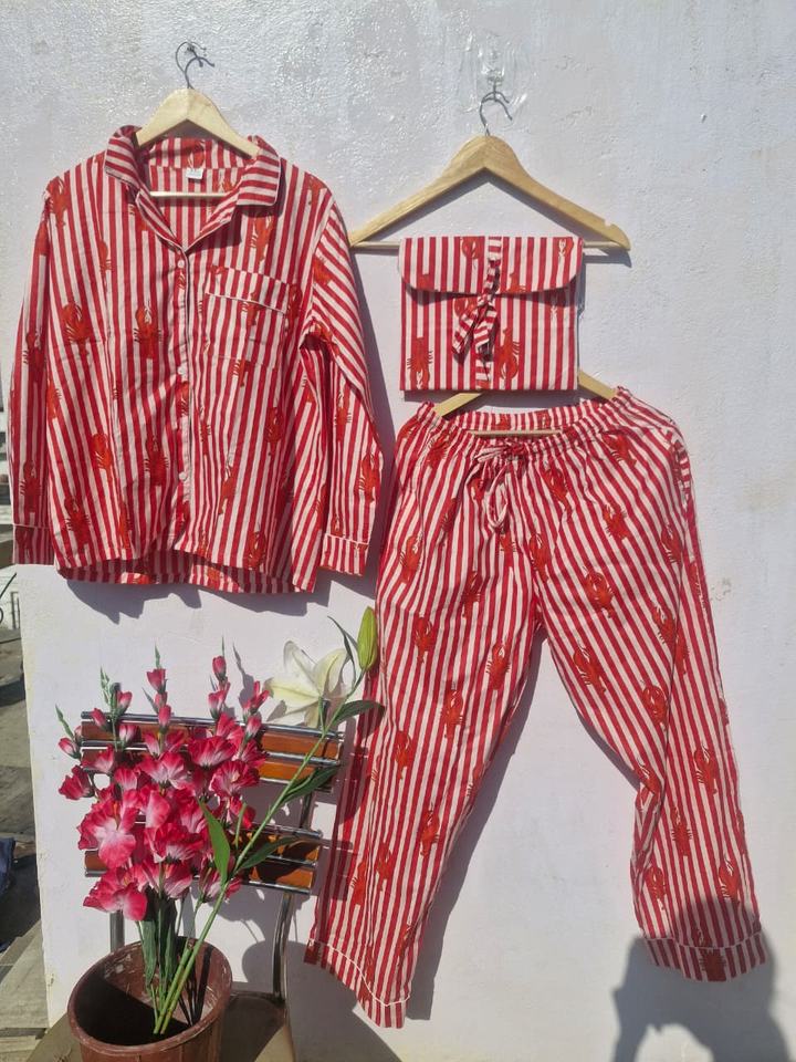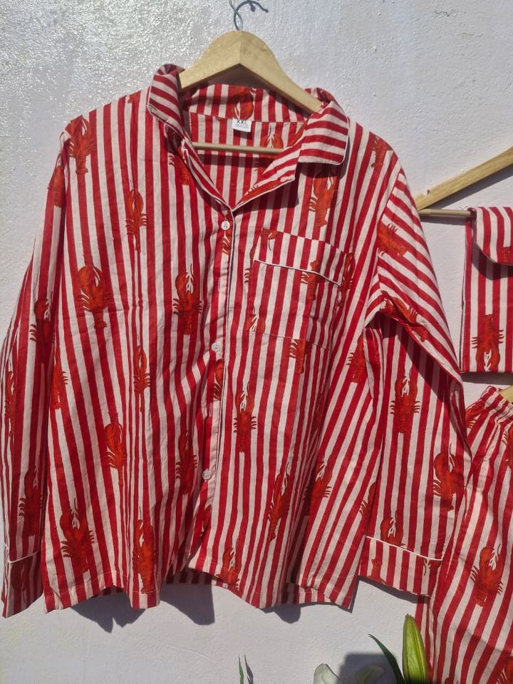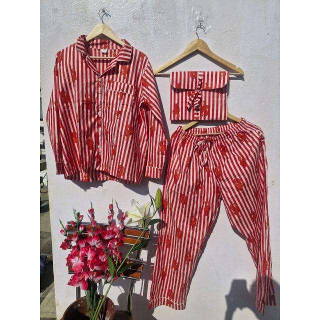ชุดนอนผ้าฝ้ายพิมพ์ลายกุ้งมังกรสำหรับผู้หญิง | ชุดนอนลายทางอินเดียทำมือ | ชุดนอนผ้ามัสลินเนื้อนุ่ม