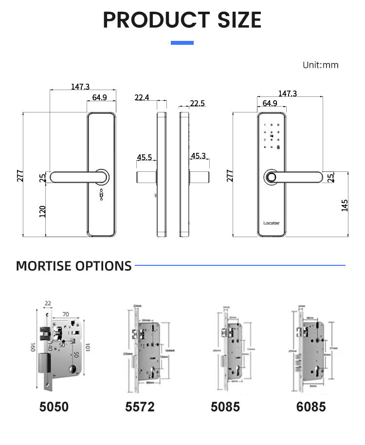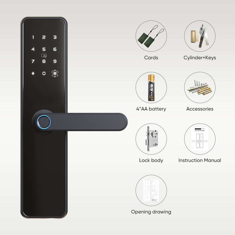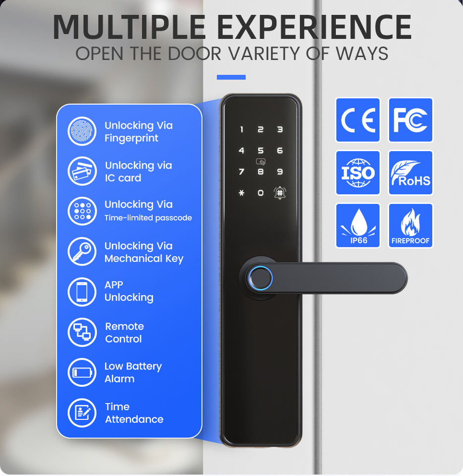 วิธีการปลดล็อกหลายวิธี: ด้วยวิธีการปลดล็อกห้าวิธี ได้แก่ ลายนิ้วมือ รหัสผ่าน บัตร IC กุญแจ และ Bluetooth ล็อกอัจฉริยะนี้มอบความยืดหยุ่นและความสะดวกสบายสำหรับความต้องการและความปลอดภัยของผู้ใช้ที่แตกต่างกัน