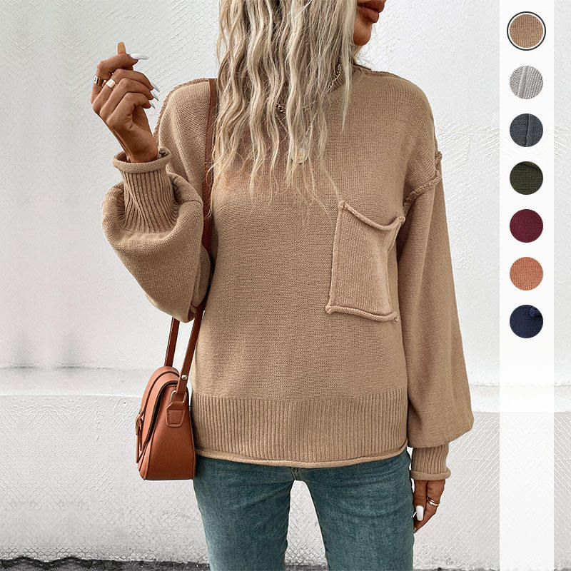 โลโก้ที่กําหนดเองฤดูใบไม้ร่วงฤดูหนาวผู้หญิงเสื้อกันหนาวเสื้อถักสีทึบรอบคอรีดขอบกระเป๋าถักเสื้อกันหนาวผู้หญิง