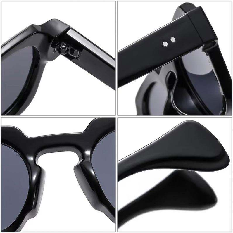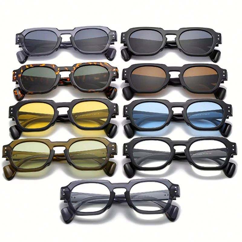 แว่นกันแดดทรงเหลี่ยมสไตล์วินเทจสำหรับผู้ชายและผู้หญิง พร้อมโลโก้แบบกำหนดเอง เลนส์ใสกันรังสียูวี 400 ตกแต่งหมุดสไตล์พังก์
