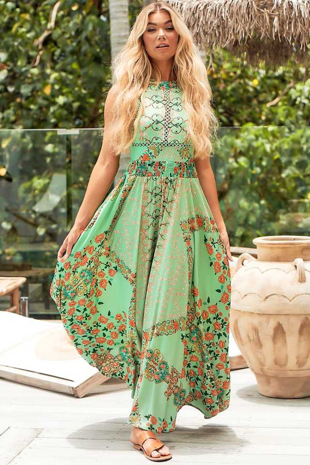 เดรสยาวคอวีลึกแขนสั้นสำหรับผู้หญิงเดรสแม็กซี่พิมพ์โลโก้สำหรับฤดูร้อน