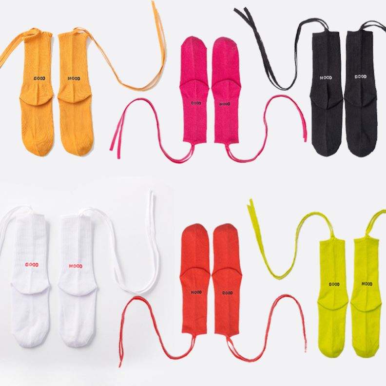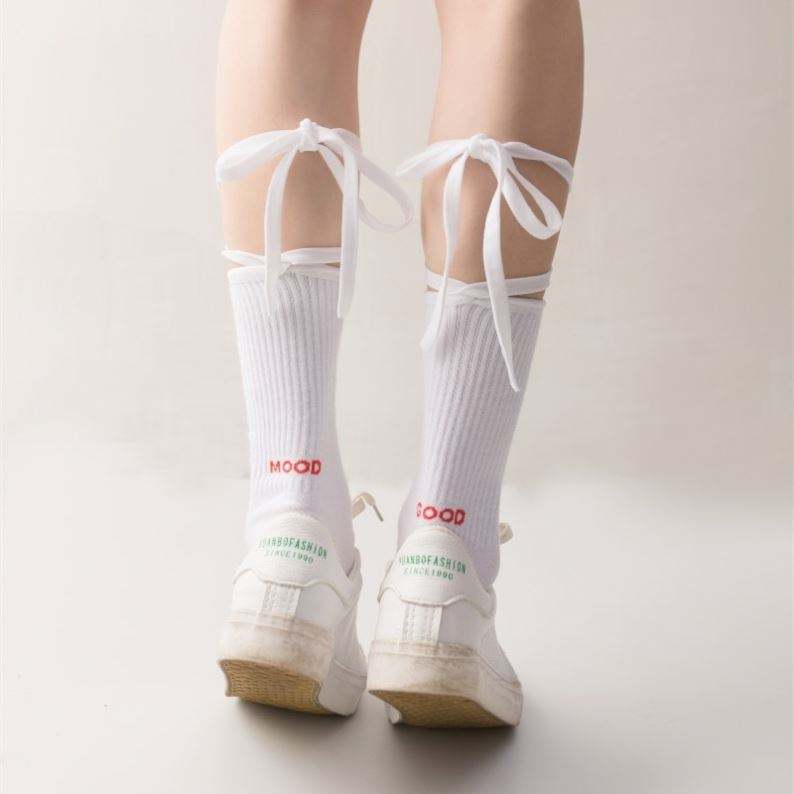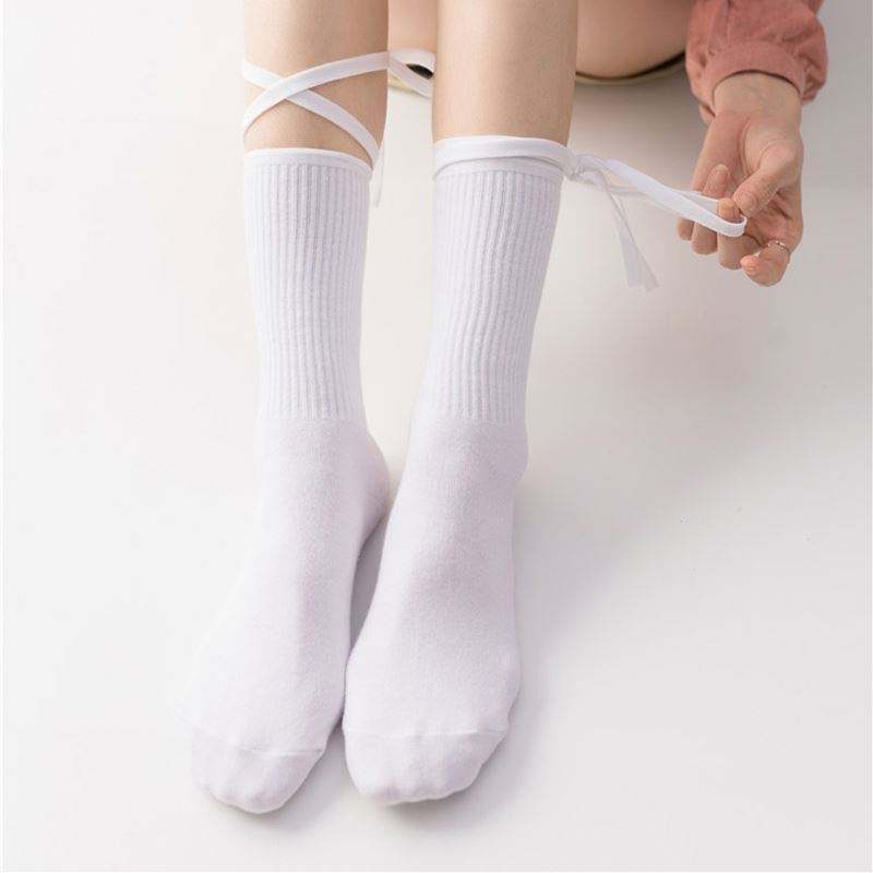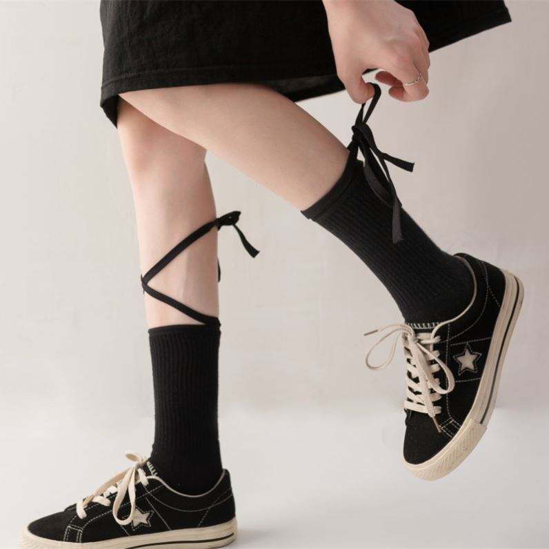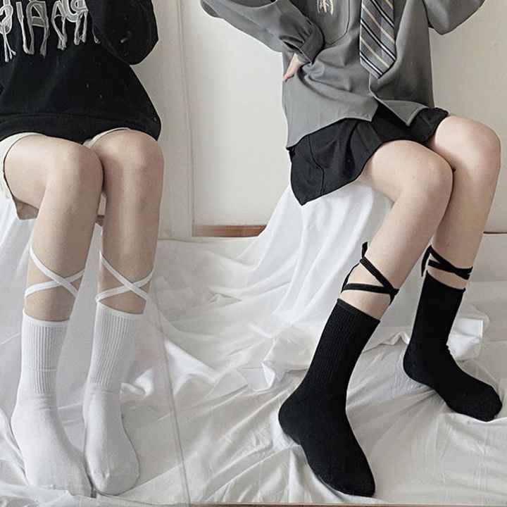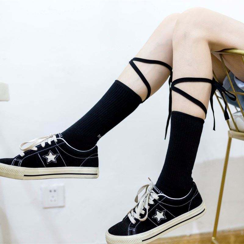 ถุงเท้าผ้าฝ้ายลายโลลิต้าแบบผูกเชือกสำหรับผู้หญิง ถุงเท้ากีฬาสีดำขาวแบบสั้น
