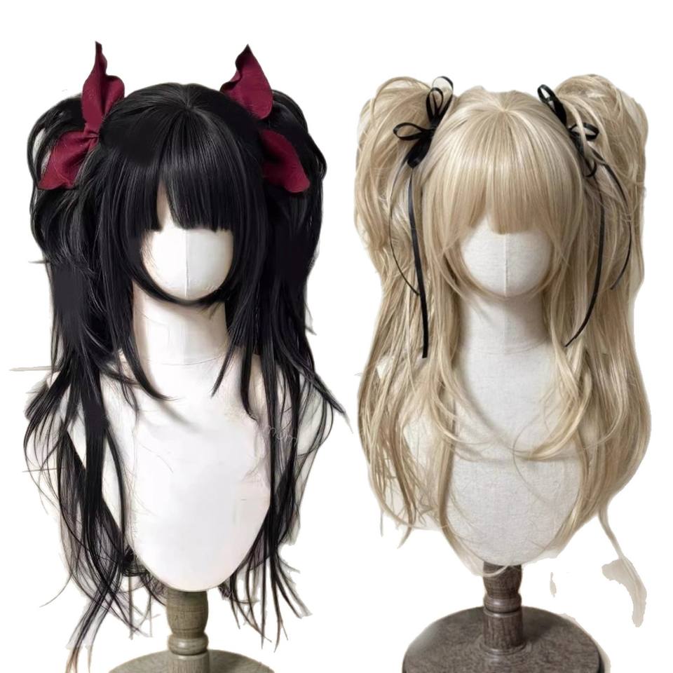 Lolita Style Layered Doll Double Ponytail Wig With Black Ribbons Full Head Cover Glueless Kanekalon Fiber For Women