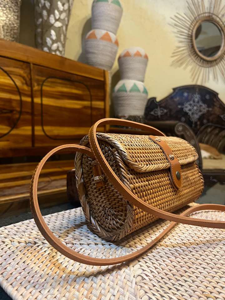 Lombok กระเป๋าหวายสานด้วยมือสไตล์มินิมอลลิสต์สายหนังแท้งานฝีมือเครื่องจักสานแบบดั้งเดิมของชาวอินโดนีเซีย