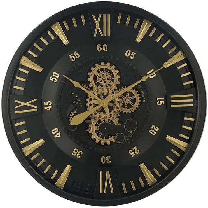 London 45 cm Rustic Analog Wall Clock in Black Gold MDF Material with Gears Roman Numerals for Living Room Decor Custom Logo