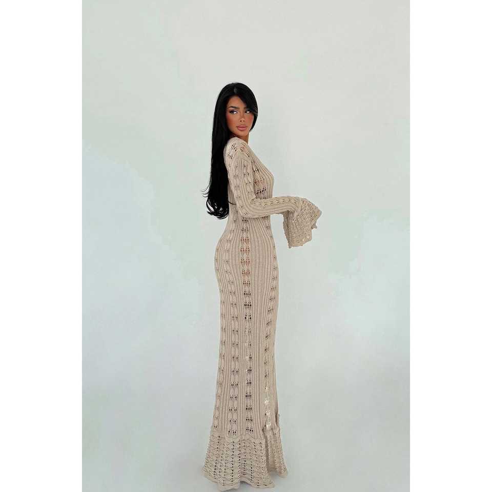 เดรสทรงเอไลน์ยาว สีเบจ กระดุมผ้าวิสโคส ผ้าขนสัตว์ ใส่ได้ทุกฤดู เอวธรรมชาติ ลายพิมพ์ ลายเรียบ ฤดูหนาว ฤดูใบไม้ร่วง ฤดูร้อน พร้อมเข็มขัด ระบาย