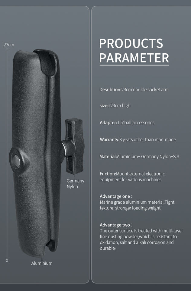 แขนซ็อกเก็ตคู่อลูมิเนียมยาวที่มีอะแดปเตอร์ขนาด1.5นิ้ว/38มม./C สามารถใช้งานร่วมกับ RAM, arkon, ibolt และอื่นๆ
