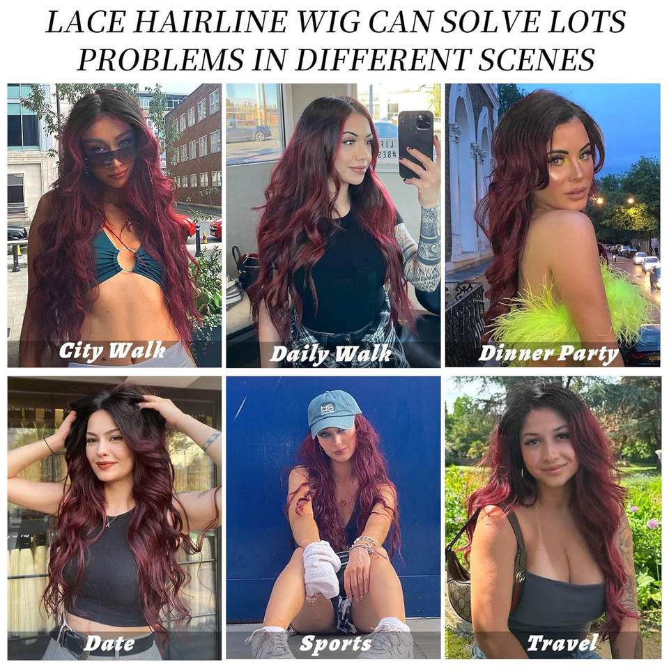 วิกผมสังเคราะห์ยาวสีบลอนด์หยักศกยาวลูกไม้ด้านหน้าของผู้หญิงผมนุ่มสบายใส่ไปปาร์ตี้ทุกวันสีแดง
