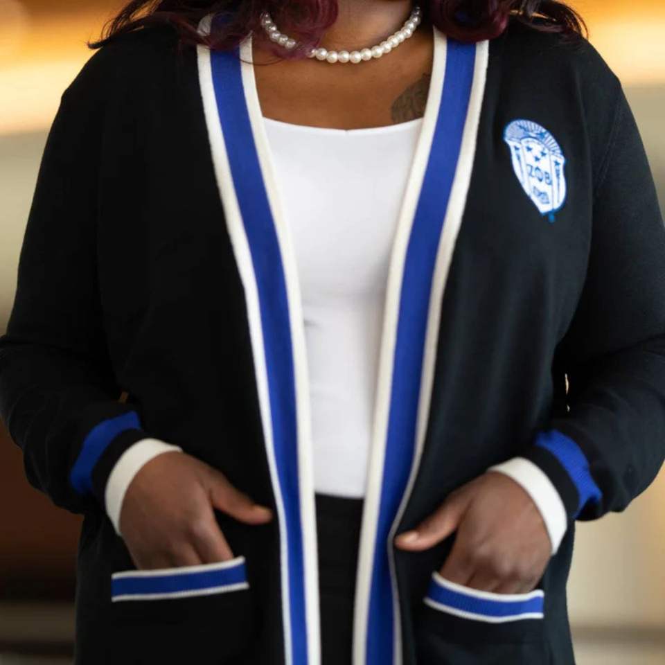 เสื้อสเวตเตอร์ถักยาวสีฟ้าชุดทางการตัดเย็บแบบสโมสรสีขาวมีโลโก้ปักชุดกรีกที่ใส่สบายทันสมัย