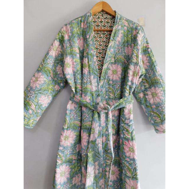 ชุดคลุมอาบน้ำผ้าฝ้ายเนื้อนุ่ม ระบายอากาศ แห้งเร็ว ลายพิมพ์บล็อก คอวี พร้อมเชือกผูก แบบลำลอง สไตล์กิโมโน เหมาะสำหรับใส่นอนในฤดูหนาว