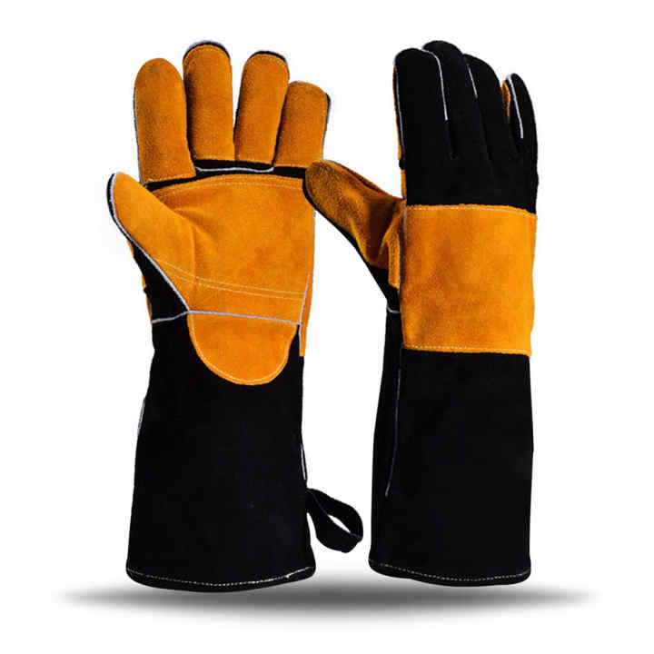 ถุงมือหนังวัวยาวแบบแยก12นิ้วกันไฟสำหรับงานเชื่อมอุตสาหกรรมความร้อนป้องกันไฟหลอมโลหะกระเซ็น