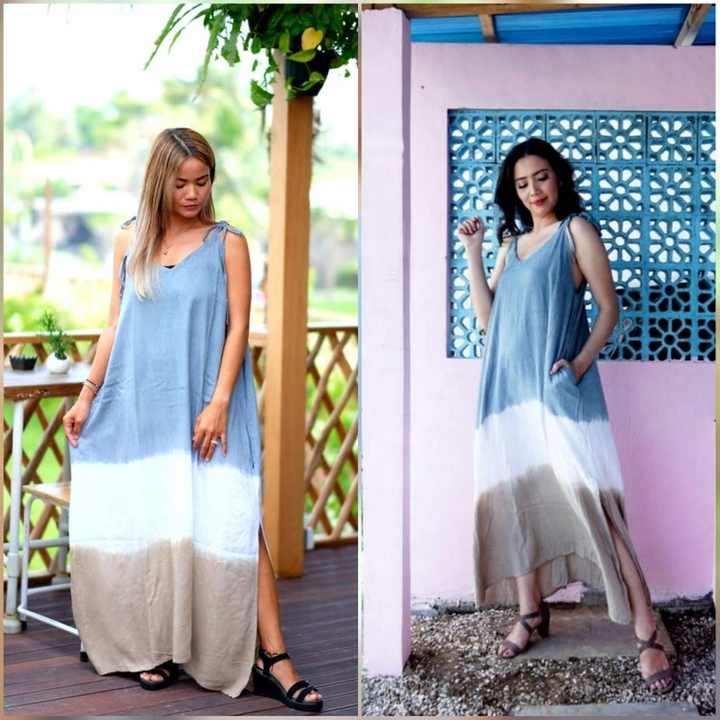 เดรสมัดย้อมสไตล์โบโฮยาวถึงพื้นทำจากผ้าเรยอนนุ่มมีกระเป๋าผ่าข้างและสายคล้องไหล่ปรับได้