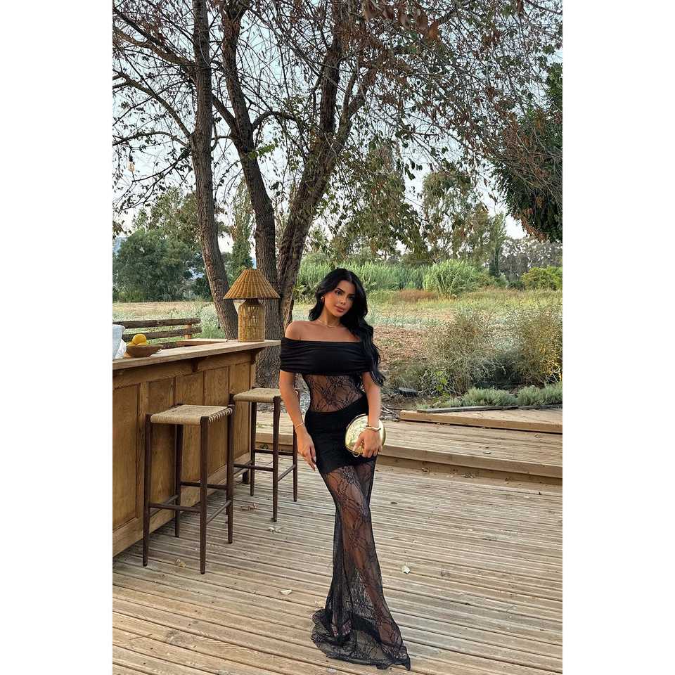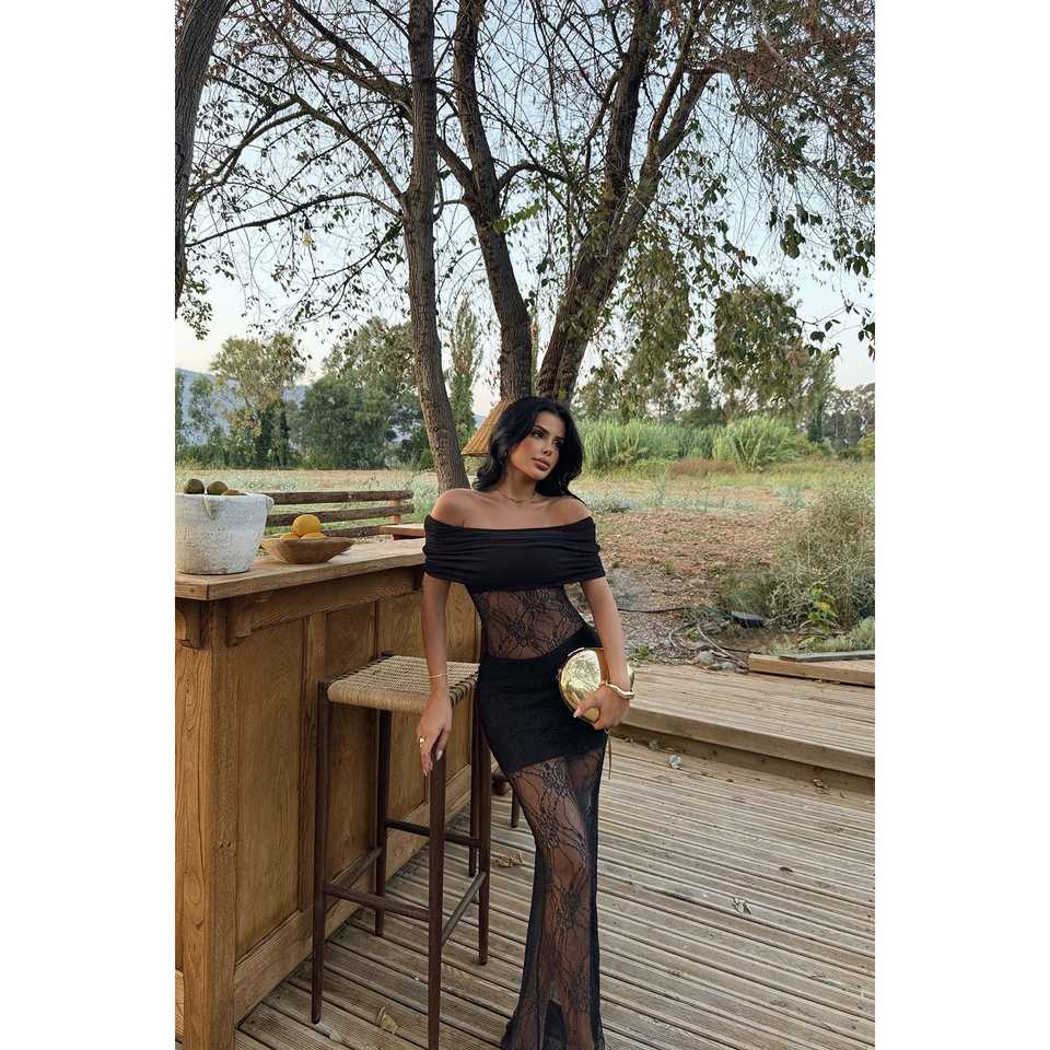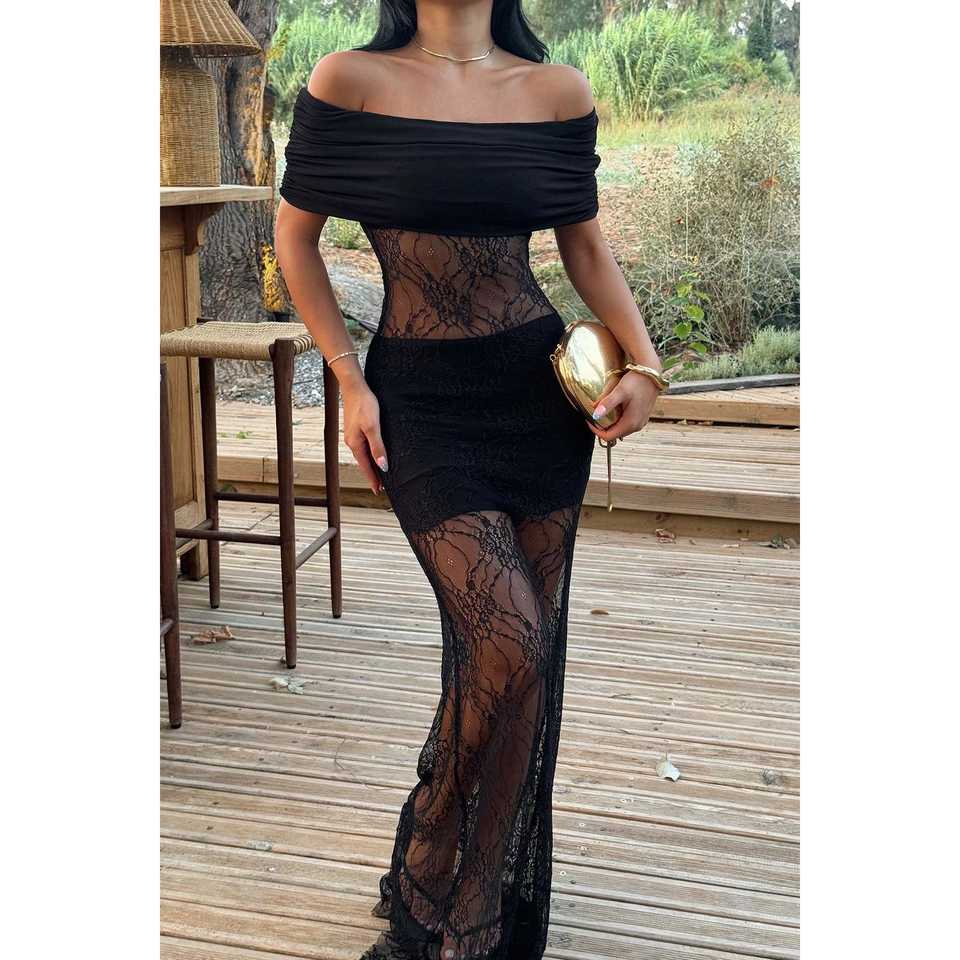 เดรสยาวทรงเอไลน์ประดับลูกไม้และเลื่อม แต่งโครเชต์ โพลีเอสเตอร์ เอวทรงเอ็มไพร์ คอรูปหัวใจ สไตล์วินเทจ ไซส์ XL สีดำ