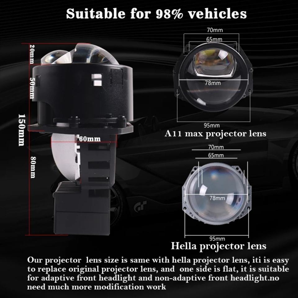 เลนส์โปรเจคเตอร์ Bi-LED รุ่น A11max 75W อายุการใช้งานยาวนาน 3.0 สำหรับรถยนต์พวงมาลัยขวา/ซ้าย รุ่นเดียว ชิป LED A6 แสง 5500K สำหรับมอเตอร์ไซค์
