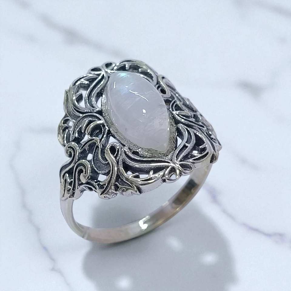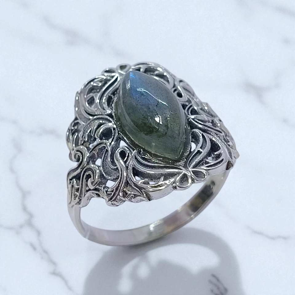 แหวนเงินแท้ 925 ประดับมูนสโตนทรงมาร์คีส์ยาวและลาบราดอไรต์ ดีไซน์โบโฮ ทำมือ งานแฮนด์เมด แรงบันดาลใจจากธรรมชาติ