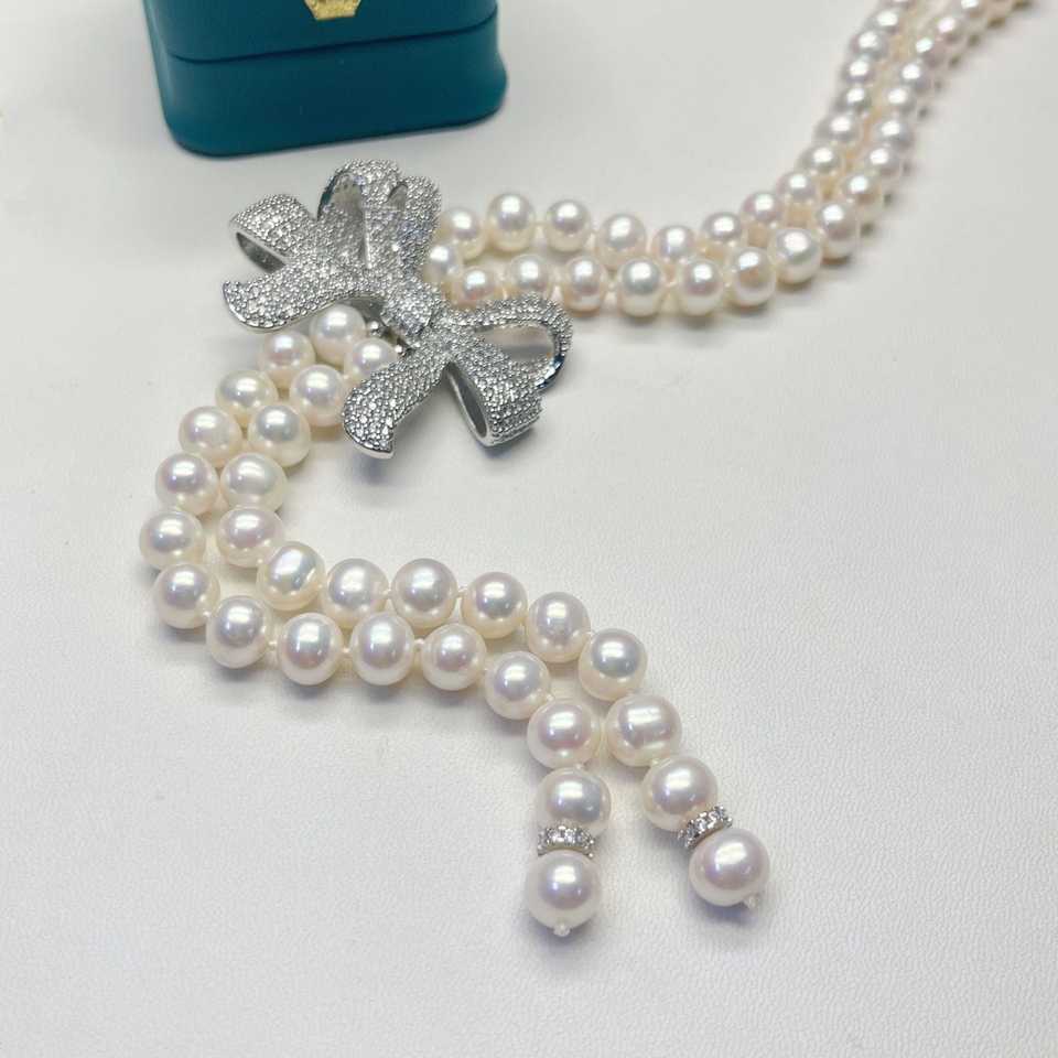 สร้อยคอประดับมุกน้ำจืดทรงยาวประดับโบว์และโซ่เสื้อสเวตเตอร์ สร้อยคอมุกสุดหรู