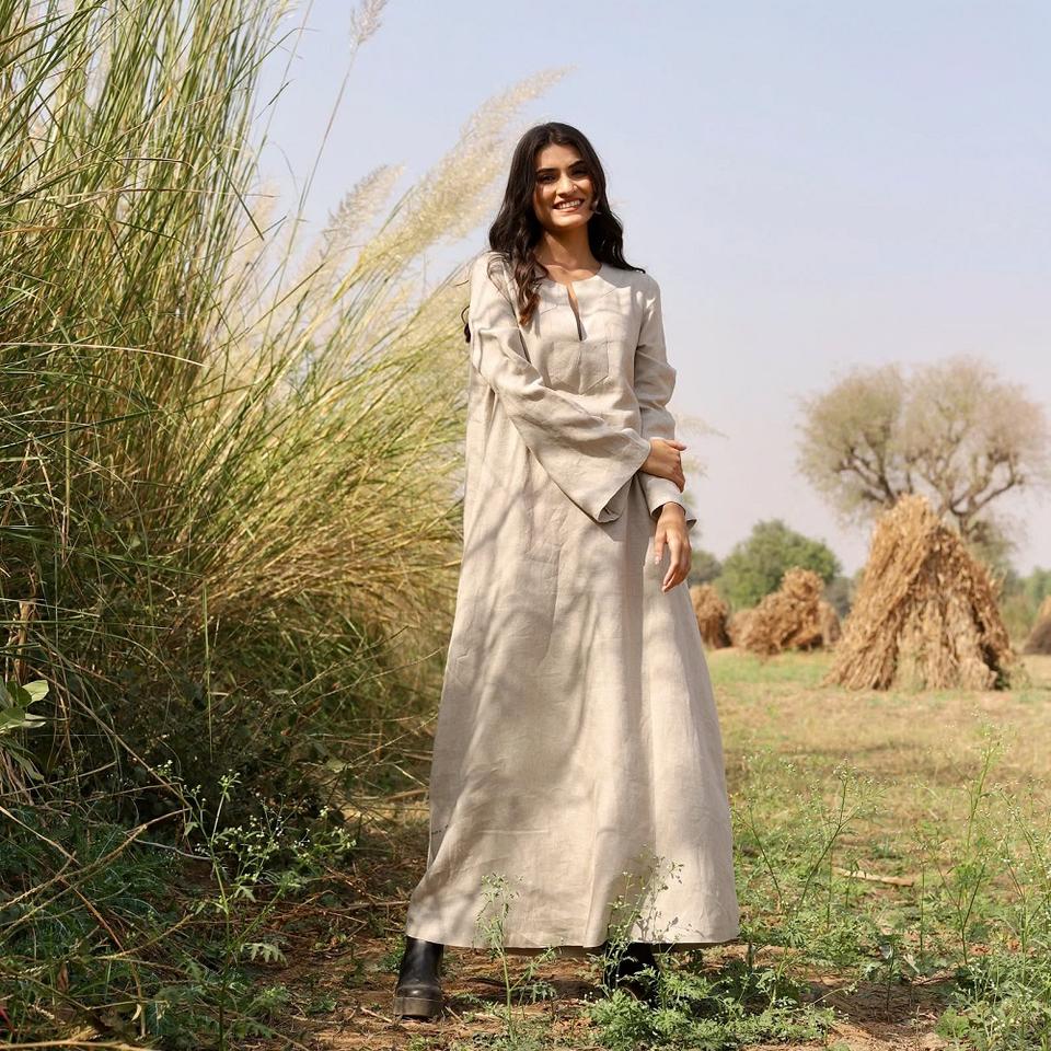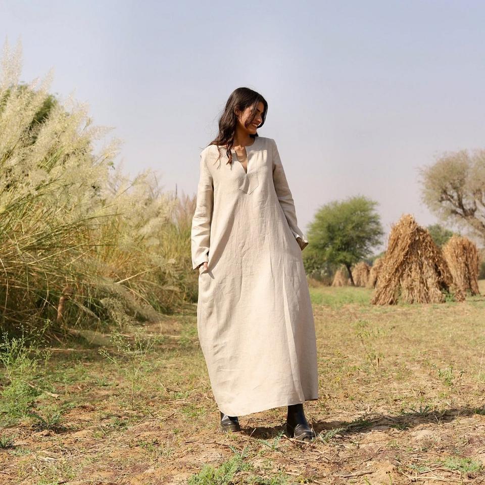 ชุดเดรสยาวผ้าลินินทรงหลวมสำหรับผู้หญิงเดรสคาฟตันทรงหลวม