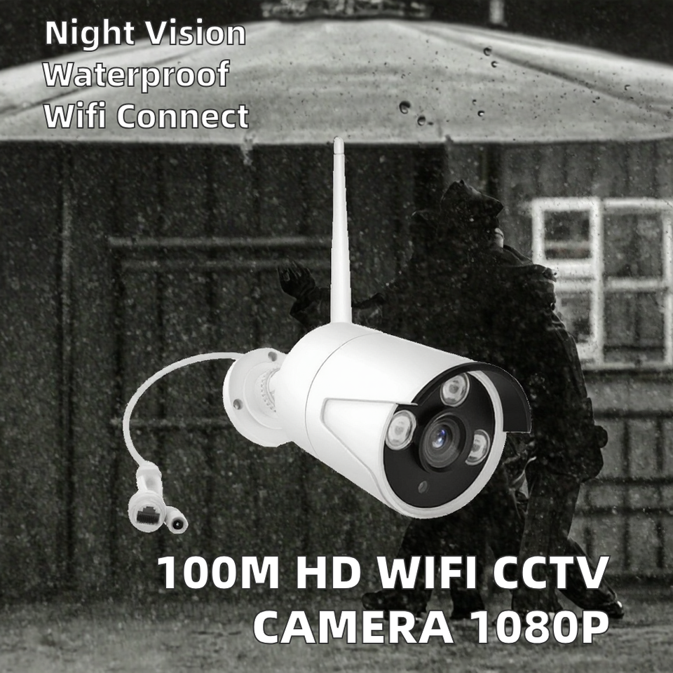 ระบบกล้องวงจรปิดไร้สายระยะไกล 100 เมตร H.264 HD ความละเอียด 1080p กล้อง Wifi มองเห็นในเวลากลางคืน กันน้ำ ใช้เทคโนโลยี IR CMOS สำหรับใช้งานภายในและภายนอกอาคาร พร้อมเครื่องบันทึก NVR