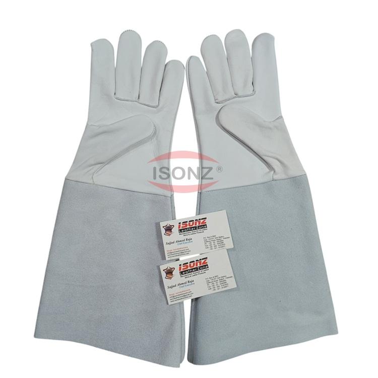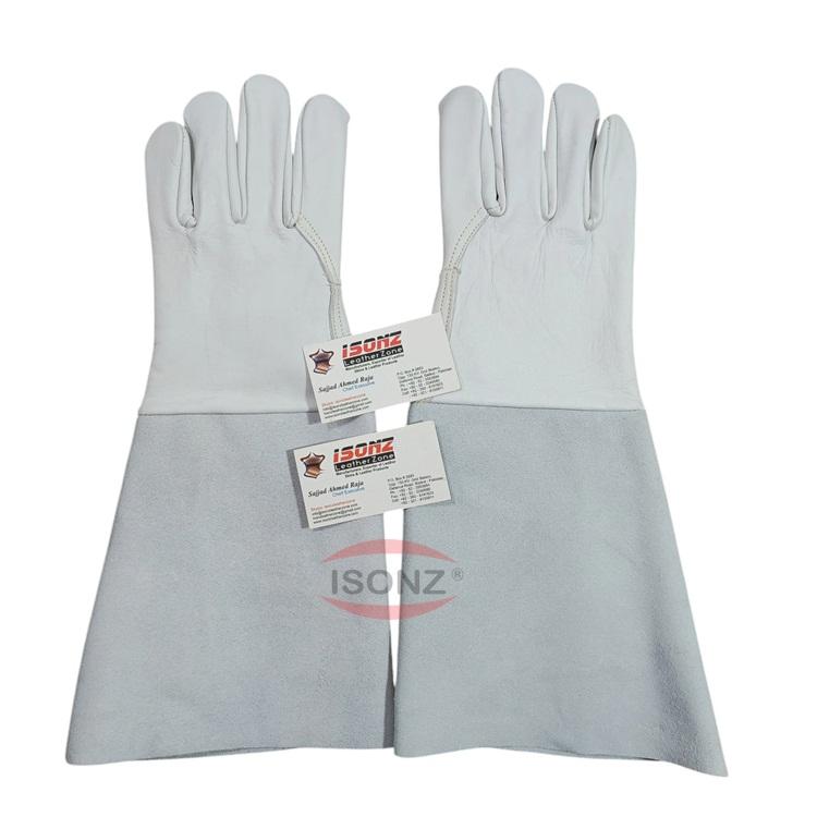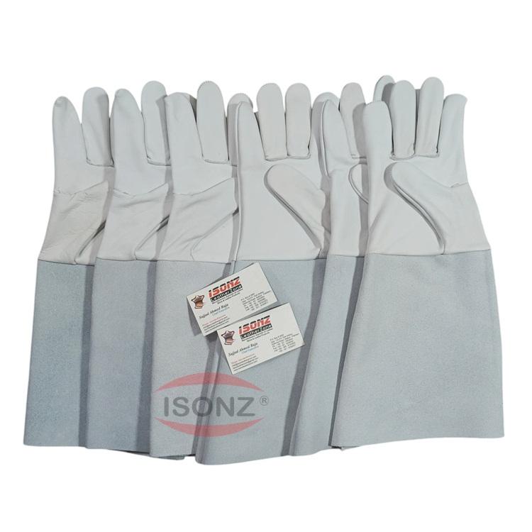 ถุงมือเชื่อมหนังลูกวัวหนังแพะคุณภาพระดับพรีเมี่ยมถุงมือหนังวัวหนังยาวแยกฝ่ามือถุงมือทนความร้อน