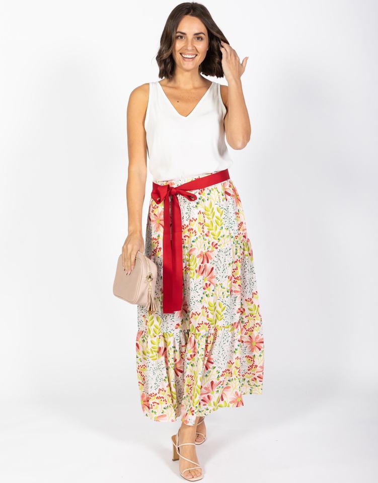 กระโปรงยาวสำหรับผู้หญิง พิมพ์ลายดอกไม้ เอวยางยืด ดีไซน์เป็นชั้นๆ ผูกเอวด้วยริบบิ้นโกรเกรน ความยาวระดับกลาง