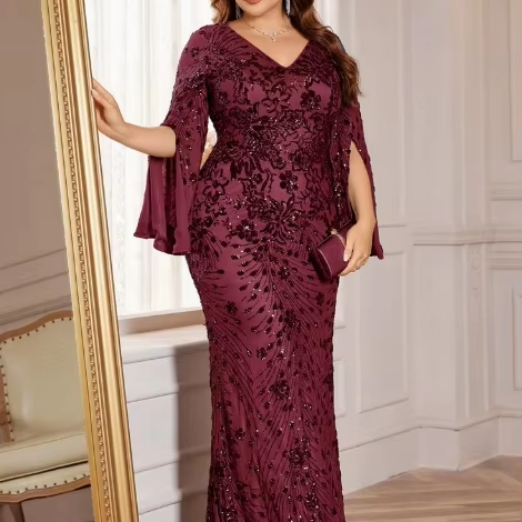 ชุดเดรสยาวแขนยาวสำหรับแม่เจ้าสาว ประดับเลื่อมวิบวับ ชุดราตรีทรงยาวสำหรับงานพิธีการ