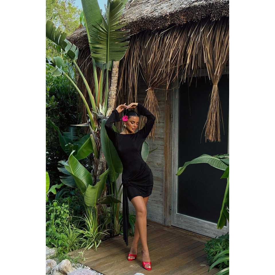 เดรสแขนยาวสีดำประดับลายกุหลาบ งานถักโครเชต์ เอวทรงเอ็มไพร์ แต่งระบาย ผ้ายืดสแปนเด็กซ์ ไซส์ XL สำหรับฤดูใบไม้ผลิ ฤดูใบไม้ร่วง งานปาร์ตี้ งานเลี้ยงสังสรรค์