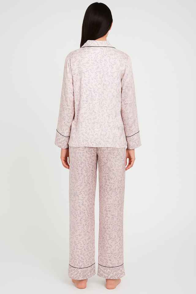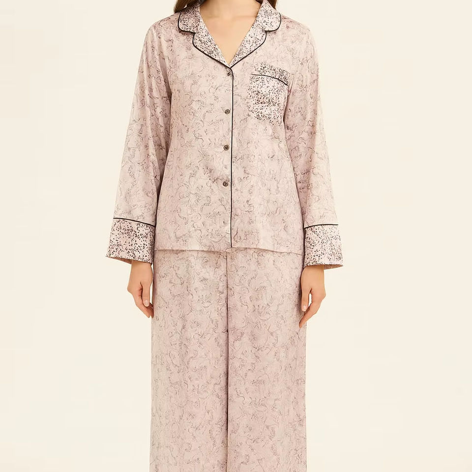 ชุดนอนผู้หญิงแขนยาวไม่มีปก ผ้าโพลีเอสเตอร์/คอตตอนเนื้อนุ่ม ลายดอกไม้ลำลอง เสื้อและกางเกง