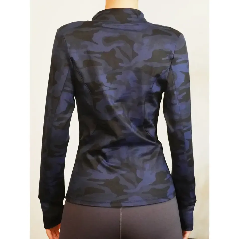 เสื้อแจ็คเก็ตแขนยาวสีน้ำเงินกรมลายพราง มีกระเป๋า ผลิตจากผ้าโพลีเอสเตอร์ผสมอีลาสเทนยืดหยุ่นสูง