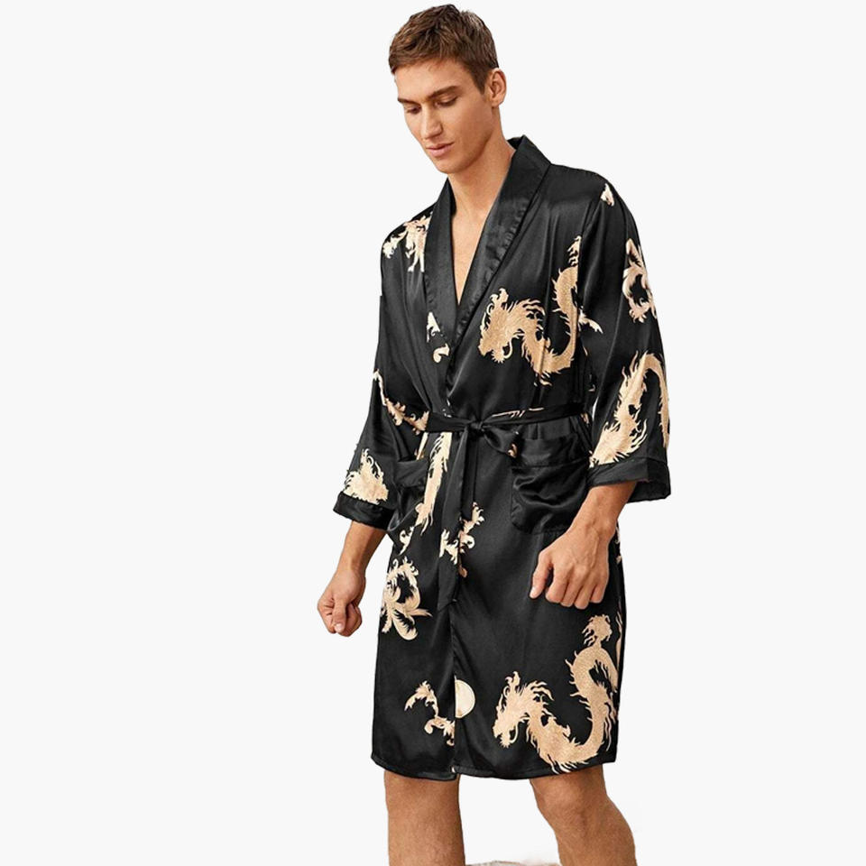 ชุดคลุมอาบน้ำแขนยาวลำลองสำหรับผู้ชาย ลายชนเผ่า ผ้าไหมหรูหรา ชุดคลุมซาตินพร้อมกางเกงขาสั้น ชุดกิโมโนระบายอากาศได้ดีสำหรับผู้ชาย แบบสั่งทำได้