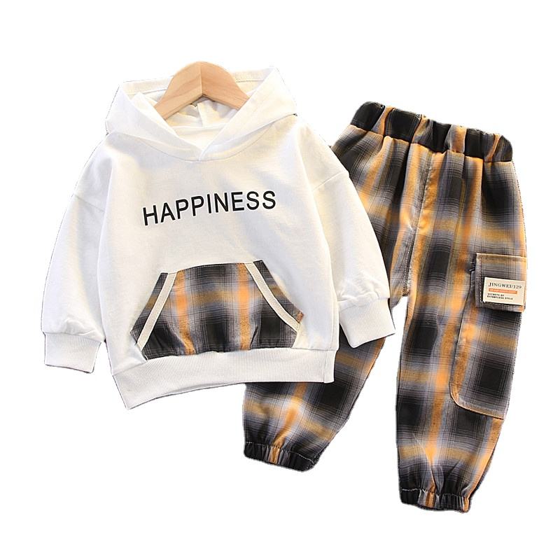 ชุดเซ็ตสองชิ้น เสื้อฮู้ดแขนยาวผ้าฝ้ายสไตล์ลำลองแบบตะวันตกสำหรับเด็กผู้ชาย พร้อมกางเกงมีฮู้ด