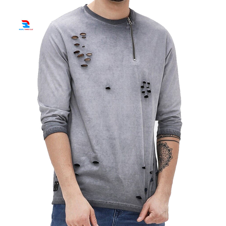 เสื้อยืดผู้ชายแขนยาวผ้าซักแบบแอซิดเสื้อเชิ๊ตผู้ชายเสื้อเชิ๊ตผ้าซิปคอกลมวินเทจ