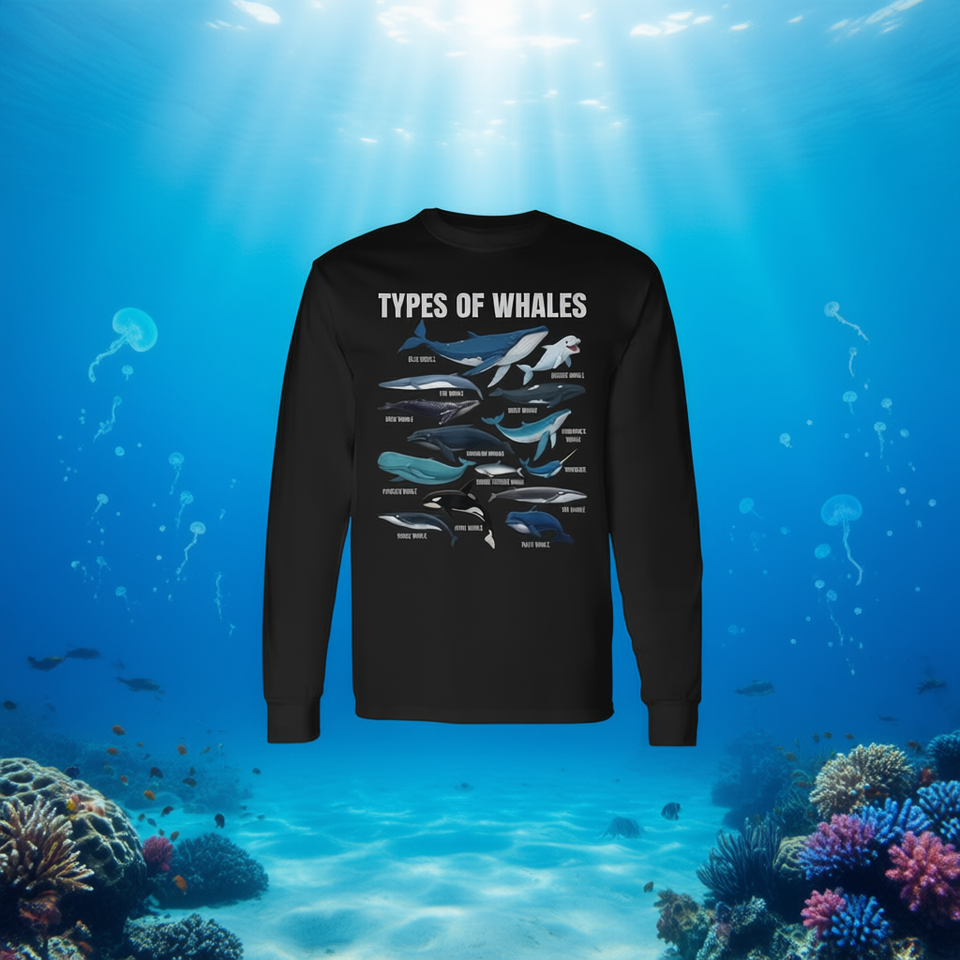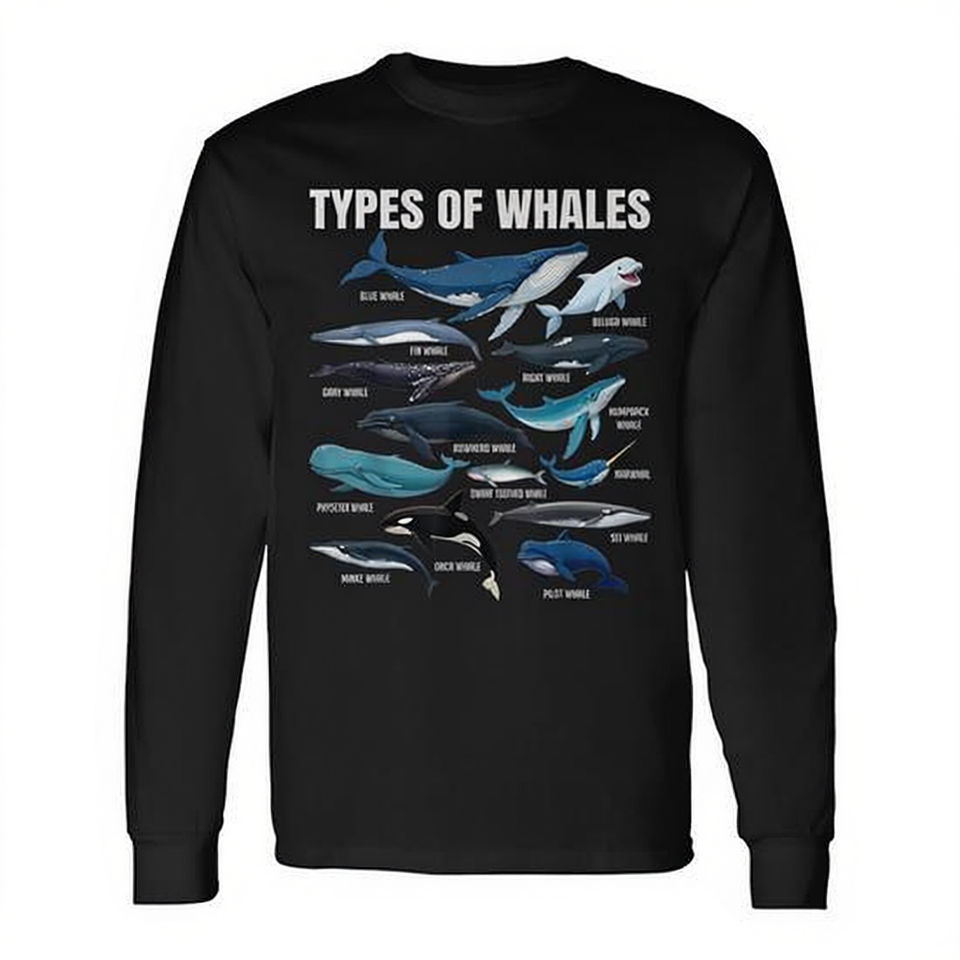 เสื้อยืดแขนยาวเพื่อการศึกษาสำหรับผู้ที่ชื่นชอบสัตว์ทะเลและนักชีววิทยา ลายปลาวาฬหลากหลายชนิด สำหรับใช้เพื่อการส่งเสริมการขาย