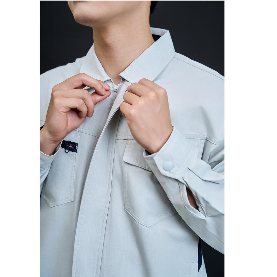 ชุดทำงานเพื่อความปลอดภัยของผู้ชายชุดเสื้อทำงานแขนยาวสีเขียวสวมใส่สบายระบายอากาศได้ดีแบบเวียดนาม