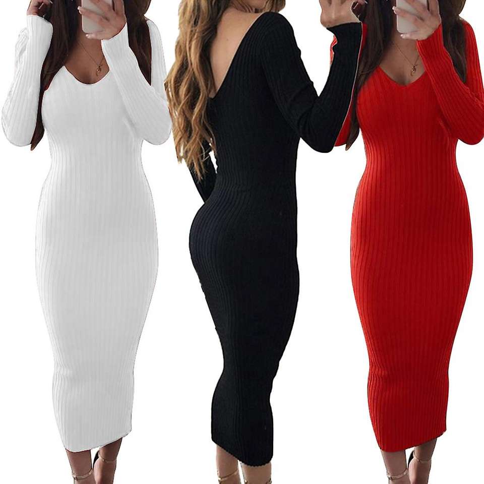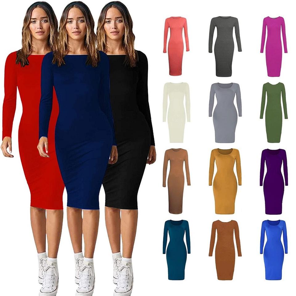 เดรสยาวแขนยาวทรงบอดี้คอนผ้าริบสำหรับผู้หญิง สีพื้น เรียบง่าย สวมใส่สบาย เหมาะสำหรับงานปาร์ตี้ เอวธรรมชาติ ชุดออกงานกลางคืนสำหรับผู้หญิง ชุดกระชับสัดส่วน มีสินค้าในสต็อก