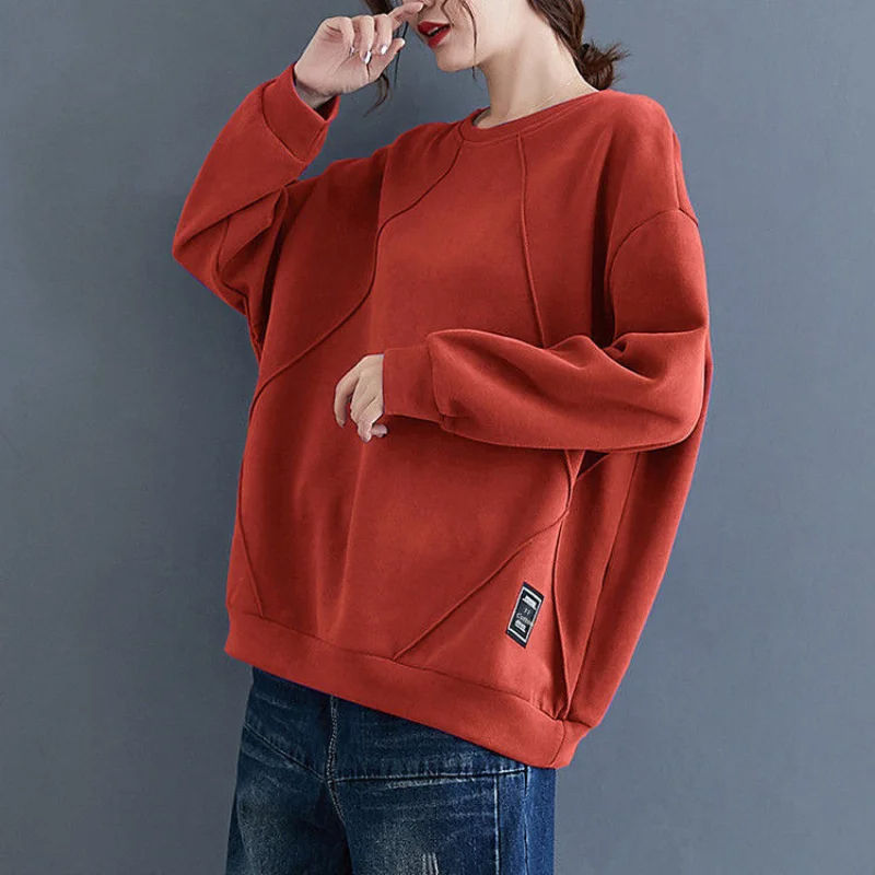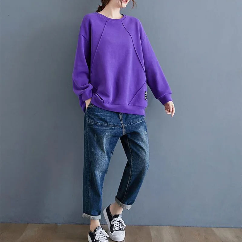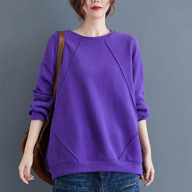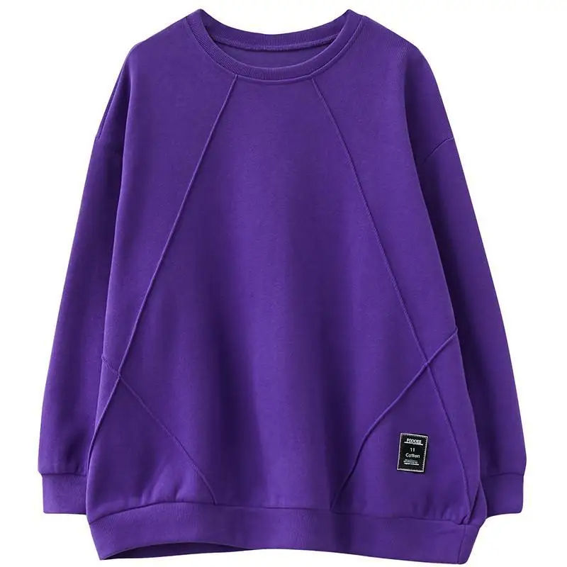 เสื้อสเวตเตอร์แขนยาวสำหรับผู้หญิง, เสื้อสเวตเตอร์ปะต่อสีพื้นทรงหลวมคอกลมเสื้อสวมหัวแฟชั่นลำลองระบายอากาศได้ดีสำหรับฤดูใบไม้ร่วงฤดูหนาว