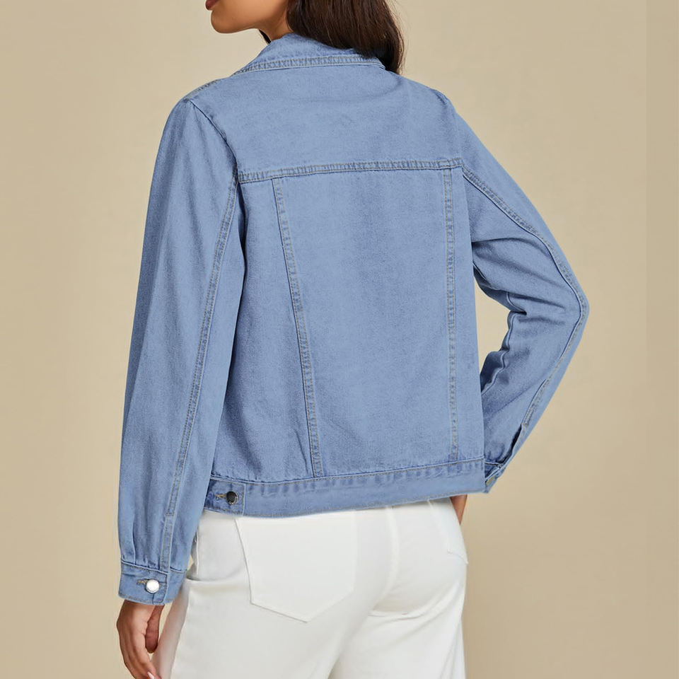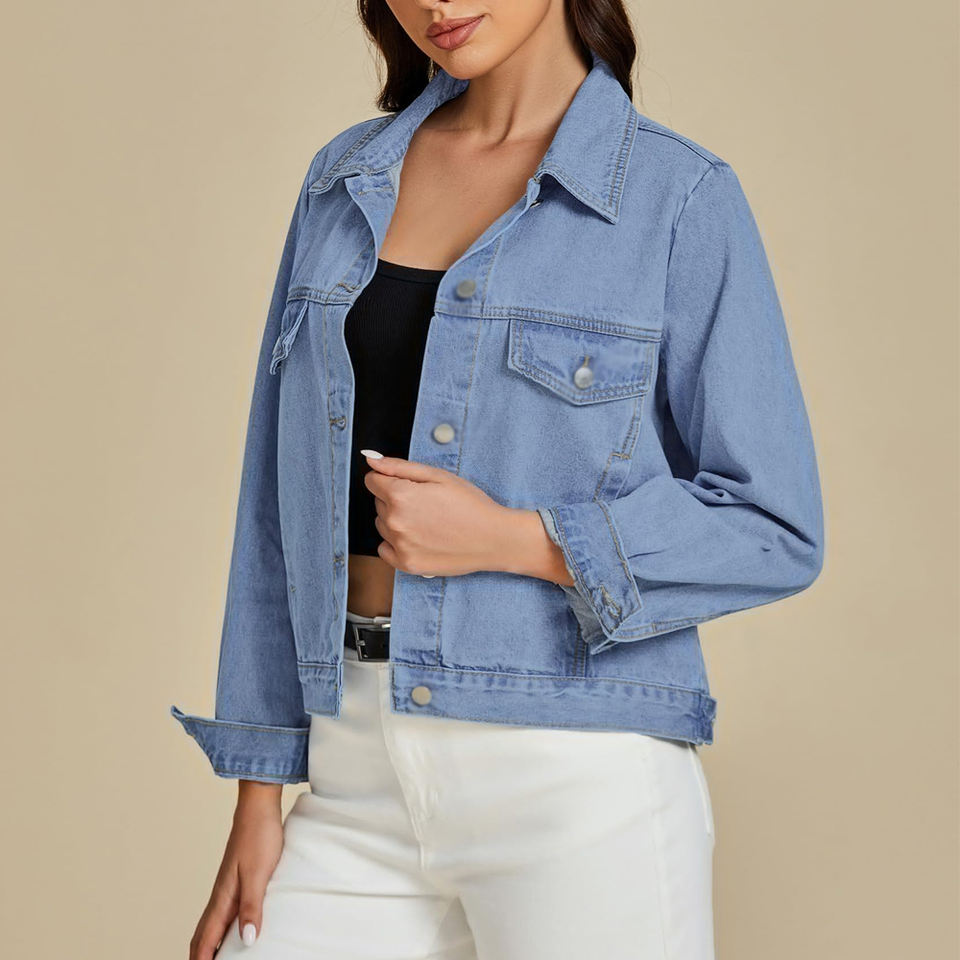 เสื้อแจ็กเก็ตยีนส์แขนยาวสำหรับผู้หญิงแจ็กเก็ตยีนส์มีกระเป๋าด้านหน้าออกแบบได้ตามต้องการ