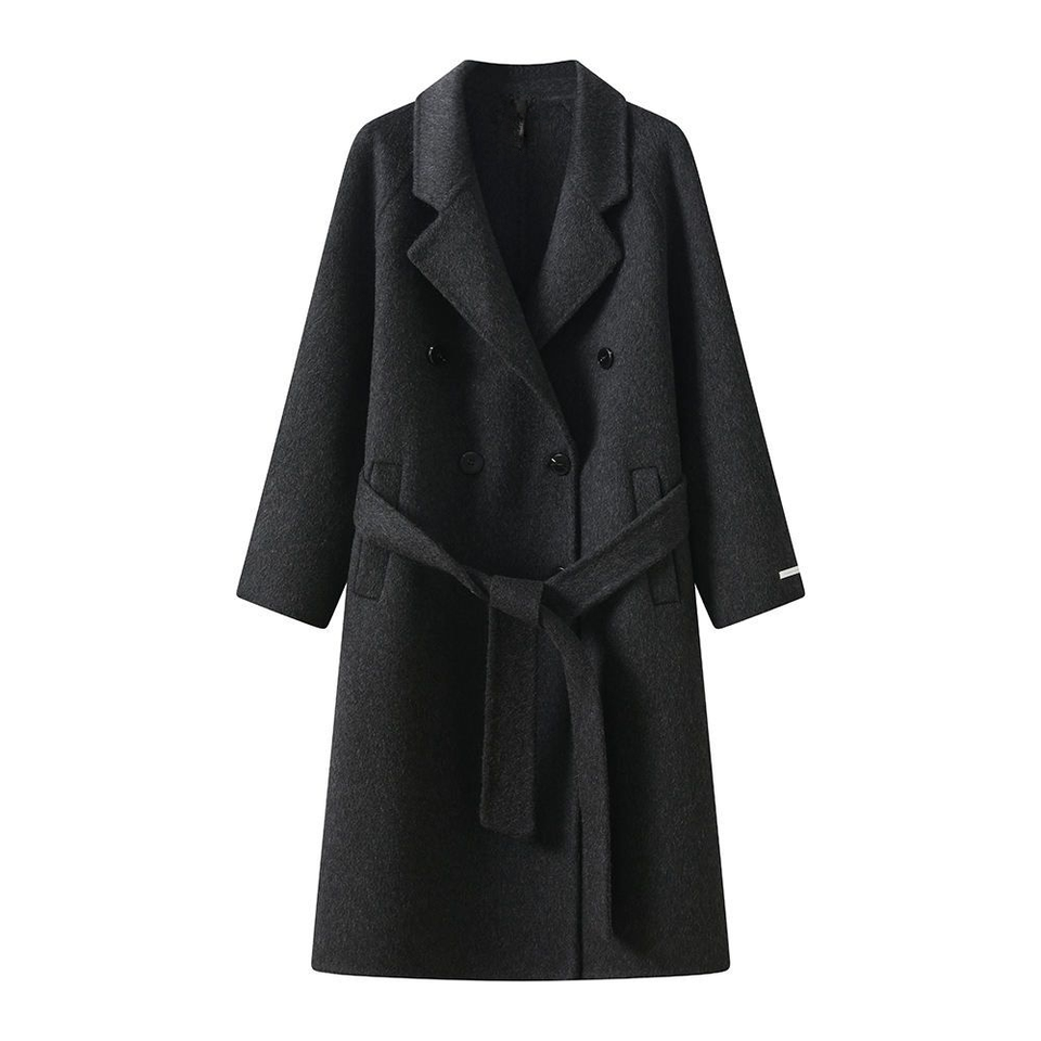 เสื้อโค้ทขนสัตว์แขนยาว กระดุมที่ข้อมือ กระดุมด้านหน้า กระเป๋าแบบมีฝาปิดที่เอว เสื้อโค้ทผู้หญิงแบบซักได้ ปิดด้วยเข็มขัด