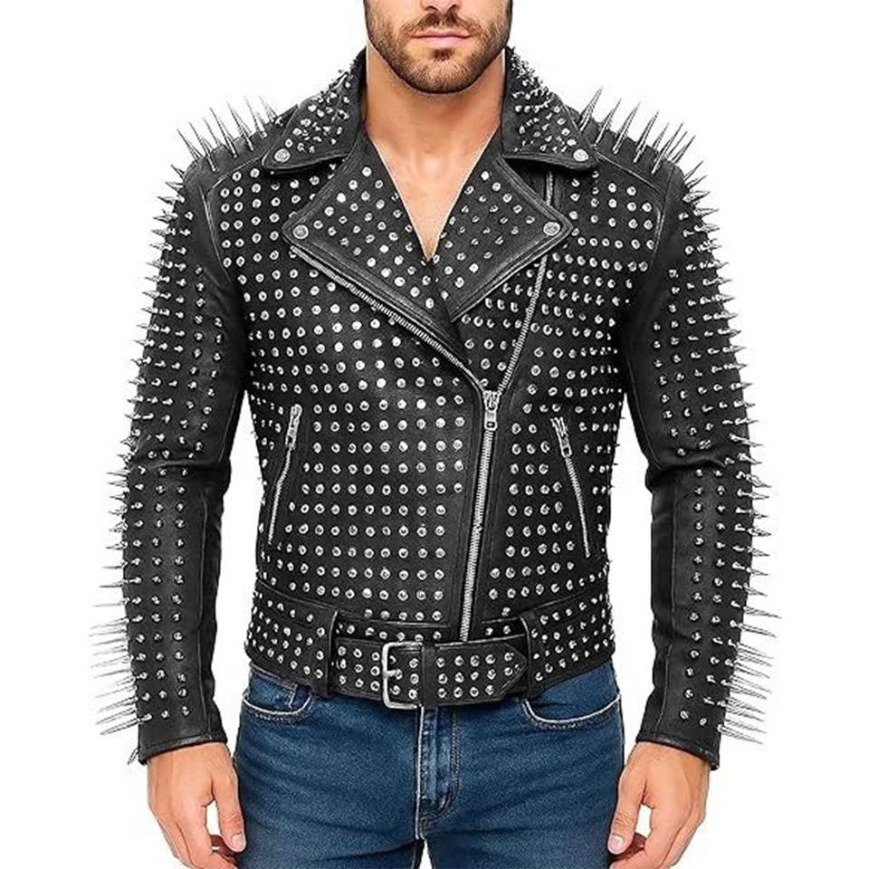 แจ็คเก็ตหนังเทียมแท้สไตล์ร็อคพังก์กอธิคประดับหมุดยาวสำหรับขี่มอเตอร์ไซค์ ทำมือ
