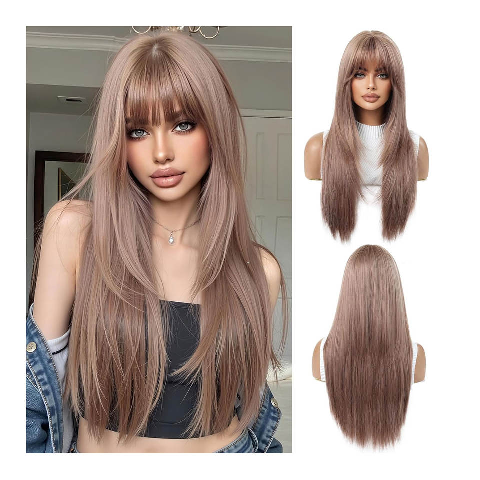 วิกผมยาวตรงสำหรับผู้หญิงสีบลอนด์ผมสังเคราะห์รากสีเข้มวัสดุเพื่อสุขภาพสตรอเบอรี่