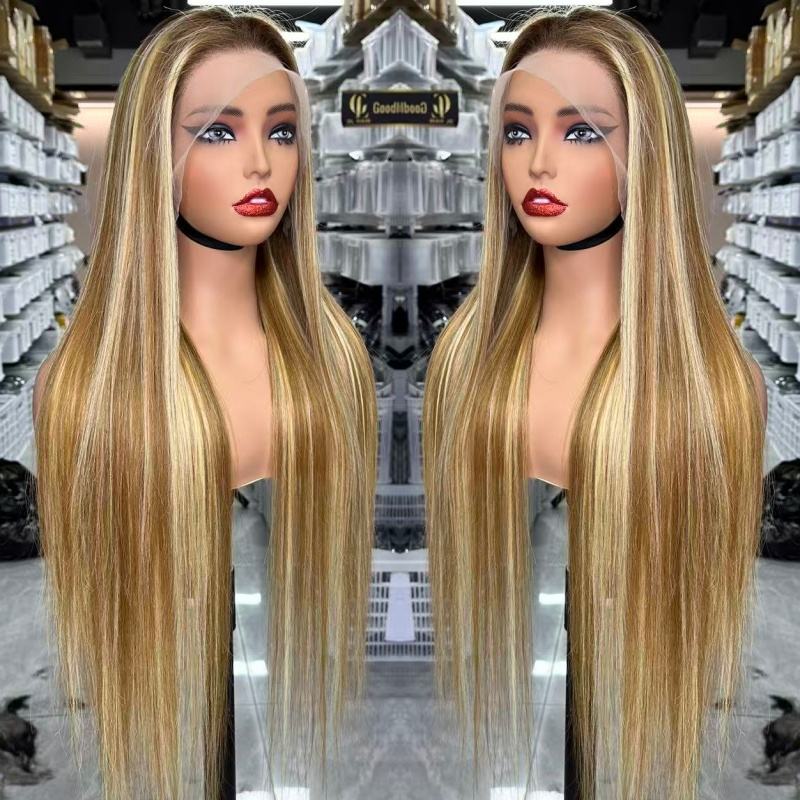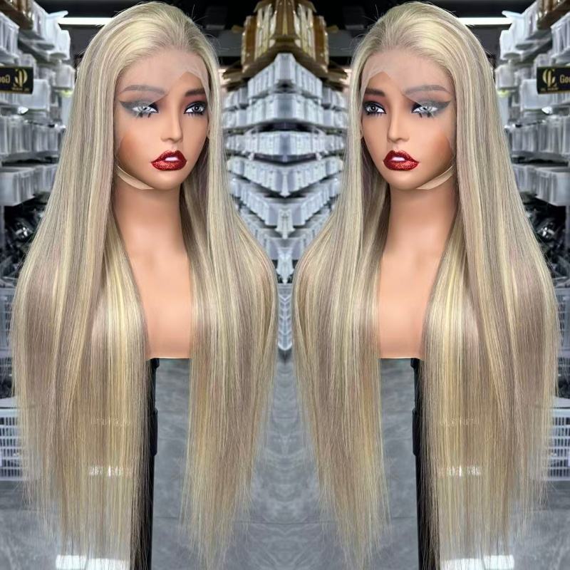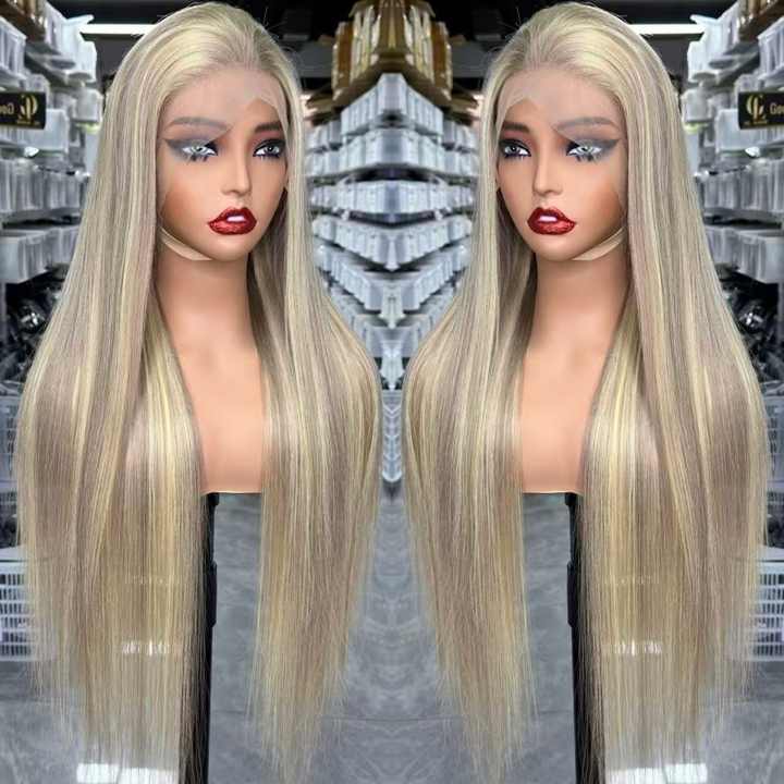 วิกผมยาวตรงแบบผมแท้ แบบผูกเชือกด้านหน้า 13x6 HD วิกผมแบบเต็มศีรษะ ผมเปรูแท้ ไฮไลท์สี 613 วิกแบบไม่ต้องใช้กาว