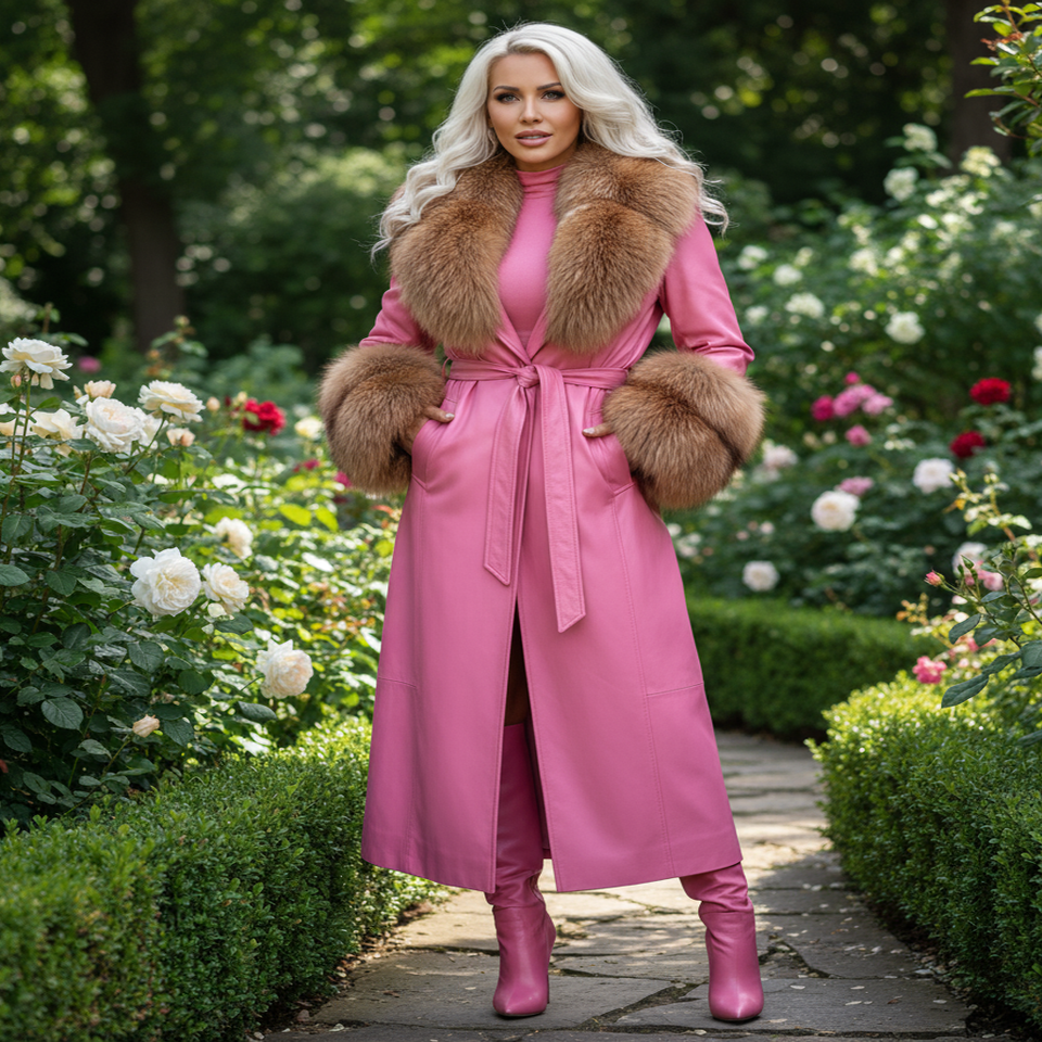 เสื้อโค้ทเทรนช์หนังปลาแบบยาวพร้อมขนสุนัขจิ้งจอกสีน้ำตาลและซับในผ้าไหม ขายส่งสั่งทำสำหรับผู้หญิง