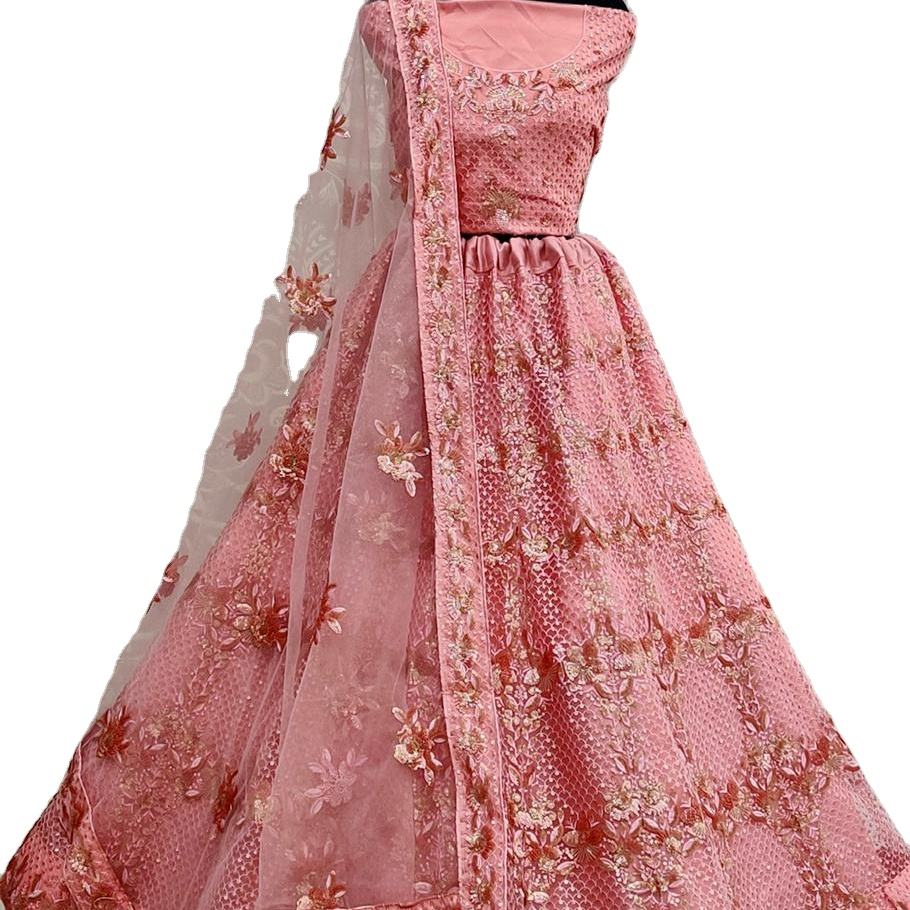 ชุดเลเฮนกาโชลีผ้าไหมสไตล์วินเทจยาวหรูหราแบบลำลองสำหรับผู้หญิง สีพีช ปักลายดอกไม้ ชุดแต่งงาน เสื้อผ้ามุสลิม