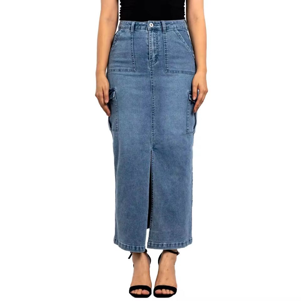 กระโปรงยีนส์ยาวทรงวายทูเค แต่งกระเป๋า เอวสูง ติดกระดุม สไตล์ลำลอง แฟชั่น พร้อมส่ง สตรีทสไตล์