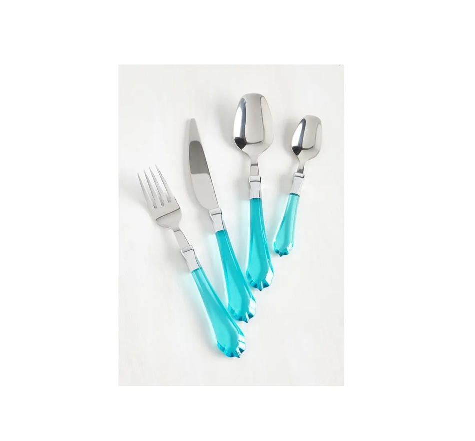 ชุดช้อนส้อมสแตนเลสที่มีด้ามจับเรซินใช้งานได้ยาวนานมีพื้นผิวขัดเงาร่วมสมัยทำจากเหล็กเคลือบเงาในราคาที่ต่ำมาก