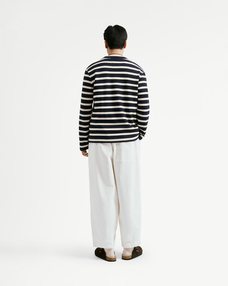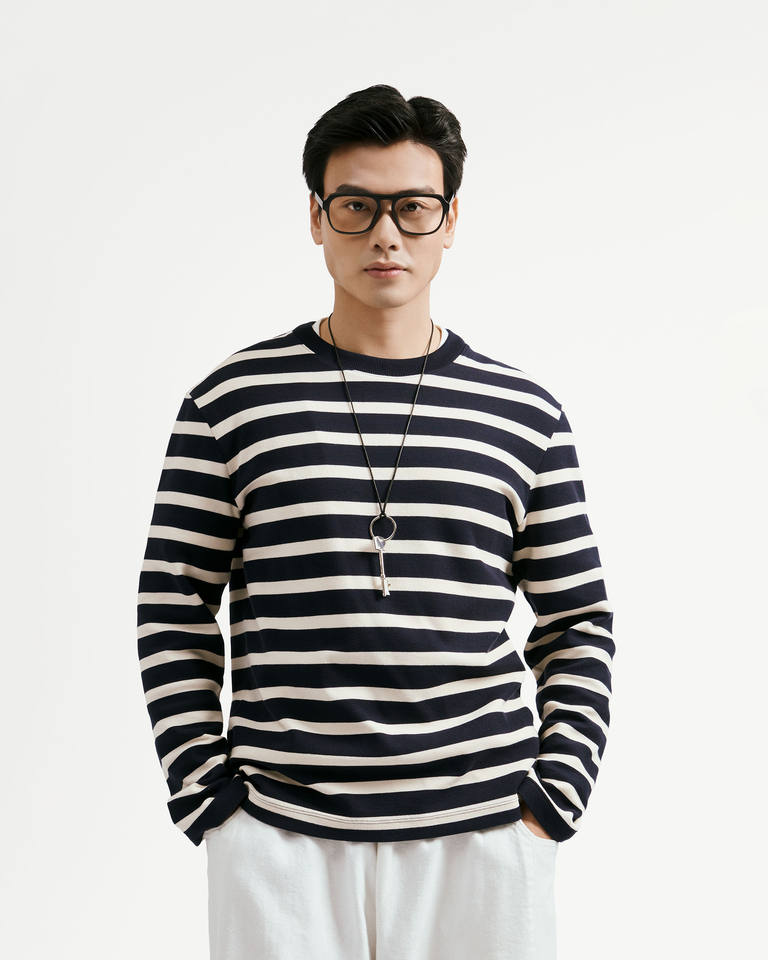 เสื้อยืดลายทางแขนยาวเข้ารูปแบบลำลองระบายอากาศได้ดีผ้าฝ้าย99% 1% อีลาสตินกำหนดขนาดเองสำหรับผู้ชายประจำฤดูใบไม้ร่วงเวียดนาม