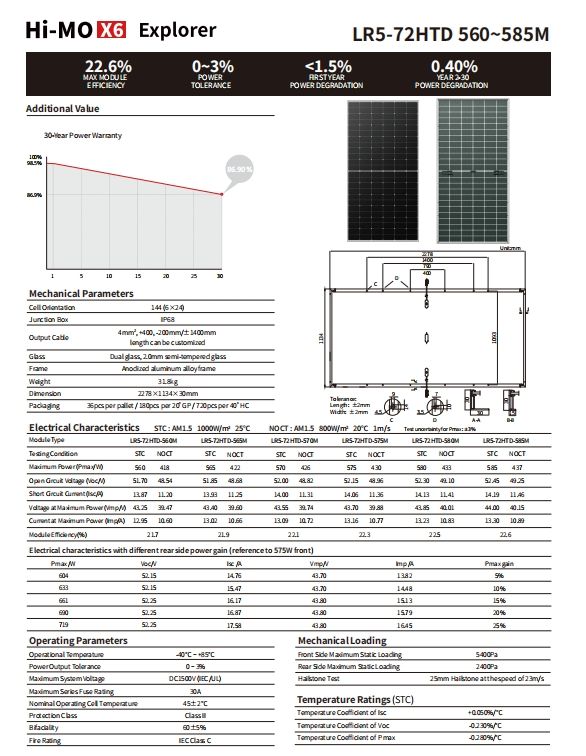 แผงโซลาร์เซลล์ Long1 LR5-72HTH นักสำรวจ6 ~ 585ม. ชนิดโมโน560W 565W 570W 575W 580W 585W LONG1