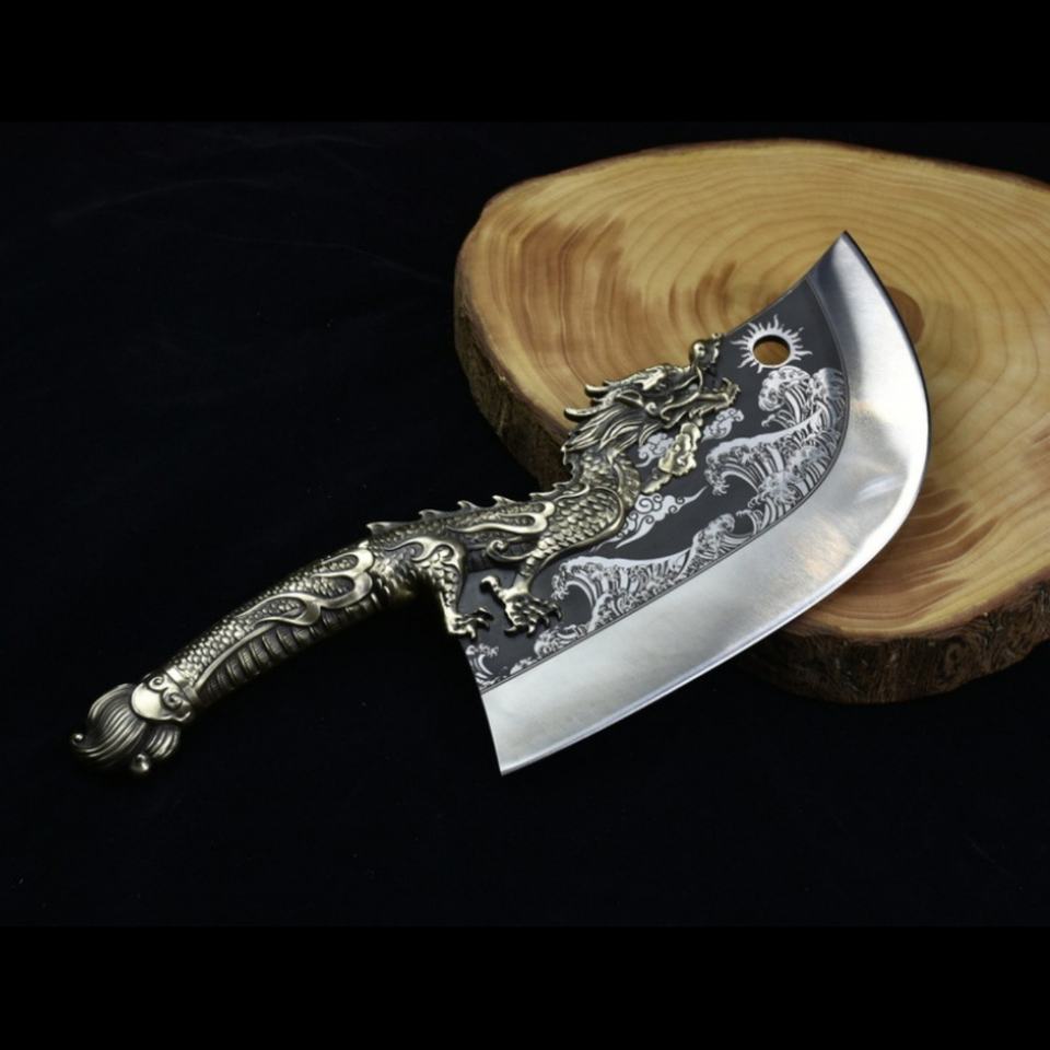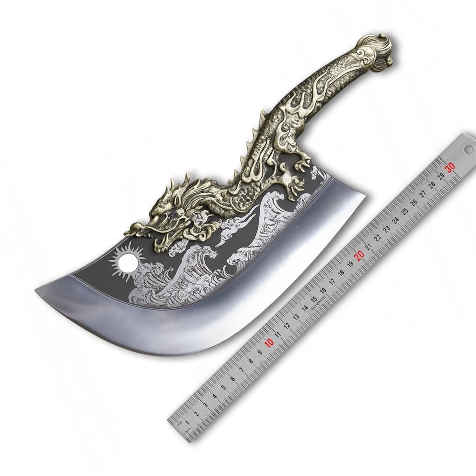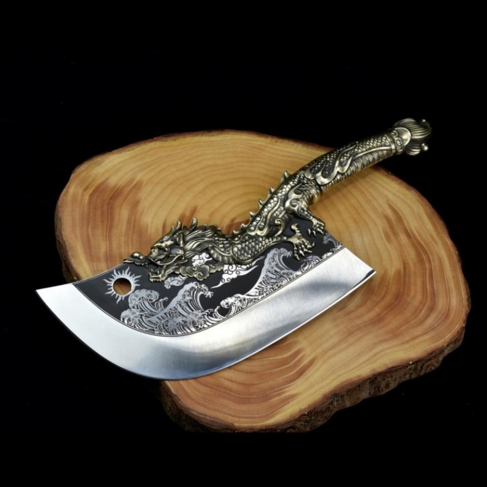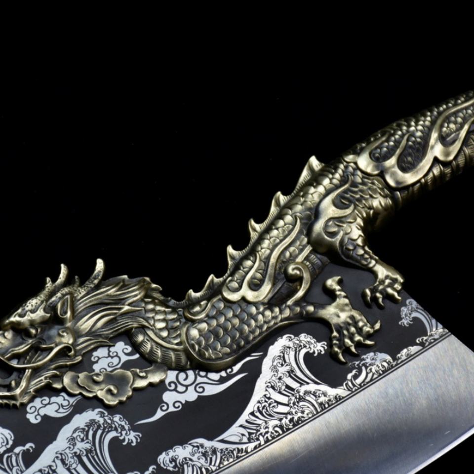 มีดเหล็กกล้าไร้สนิม Longquan ตีขึ้นรูปด้วยมือ ลายมังกรสีฟ้าไล่คลื่น ขนาด 24 ซม. ด้ามจับแบบสองมือ ใช้ในครัวเรือน ผลิตตามแบบ OEM